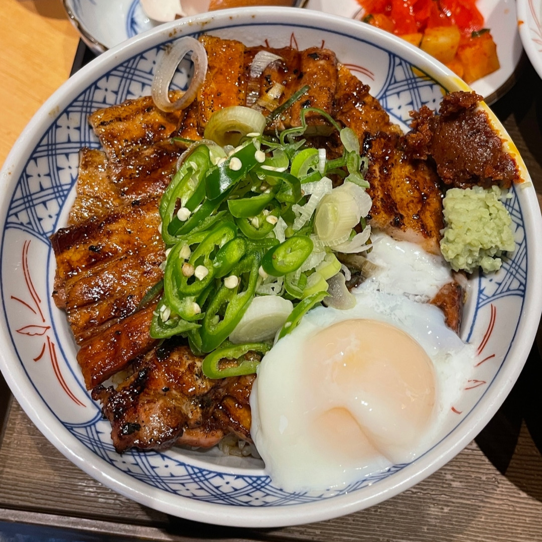 이런 생각들을 수첩에 적으면서 가방 잘 챙겨왔다고 생각하고 있으니, 주문한 '매운 부타동'이 나왔어요. 매운 걸 좋아해서 시킨 건데 예상하지 못한 청양고추도 듬뿍 올라가 있어서 너무 신났어요. 반짝반짝 윤기 나는 삼겹살을 보니 당장 먹고 싶었지만, 네모난 반찬 통에 담긴 빨간 단무지와 깍두기부터 접시에 덜었어요. 반찬을 많이 먹는 스타일이거든요. 와사비와 매운 미소장도 한 스푼씩 떠서 그릇 한 켠에 올려두고 같이 나온 온센 타마고(온천 계란)도 까서 밥 위에 올렸어요. 완전 부들부들한 반반숙 계란을 보는 제 마음도 몽글몽글해졌어요.