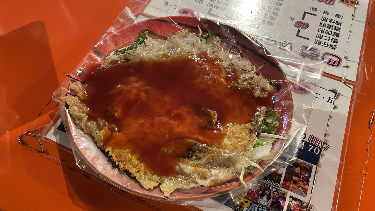 온갖 맛있는 음식으로 가득한 야시장을 돌아다니다 어느 가게 앞에서 멈췄다. 대만 야시장의 트레이드 마크, 굴전(蚵仔煎)을 파는 곳이었다. 실시간으로 굴전을 굽는 모습에 홀린 듯 들어가 자리를 잡고 앉았다. 메뉴판이 붙어 있는 빨간 플라스틱 테이블이 마치 우리나라의 포장마차 같았다. 비록 초록병 쐬주와 우동은 없지만 대신 굴전을 주문하고 잠시 기다리니 드디어 굴전이 나왔다.