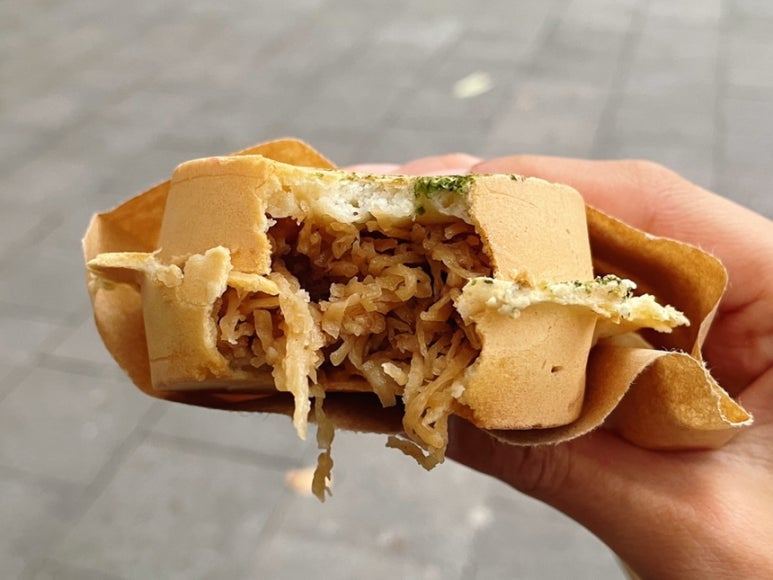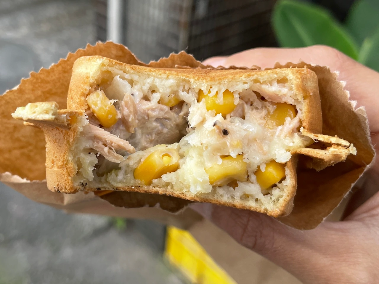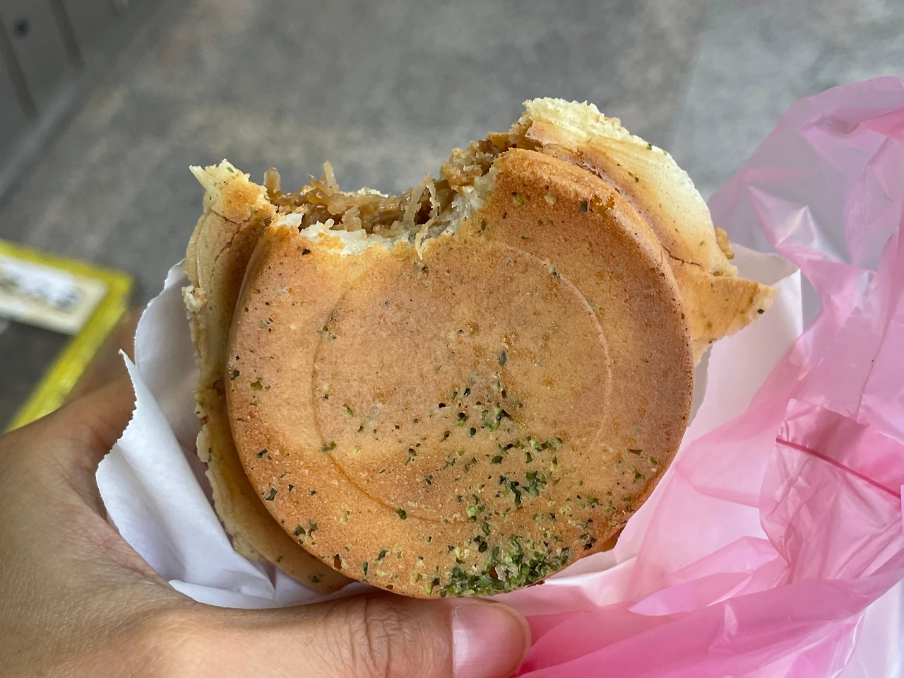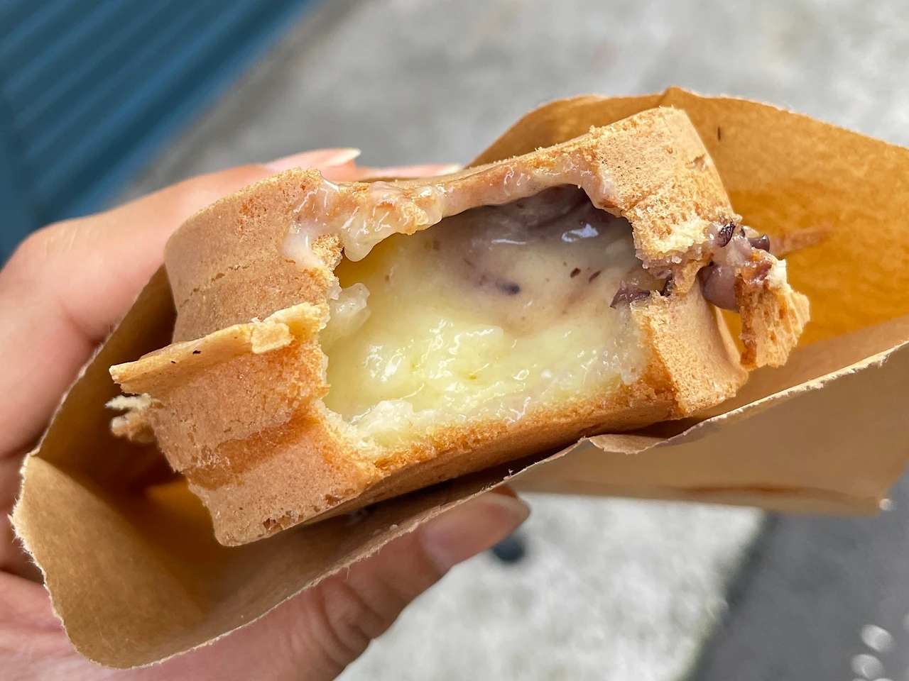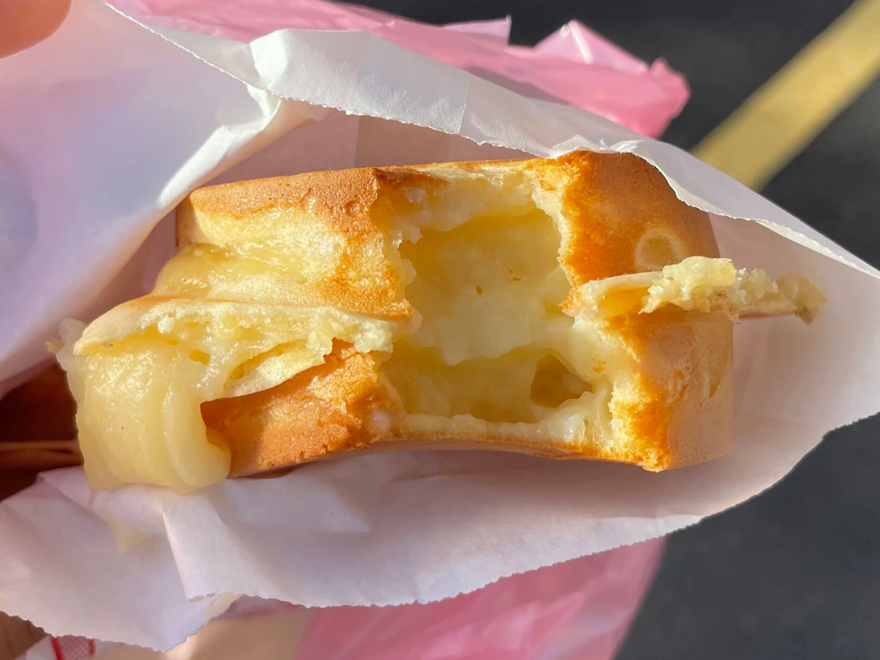 겉의 반죽에서 팬케이크에 가까운 맛이 나고 쫀득하기보다 바삭한 식감이라는 점이 조금 달라요.