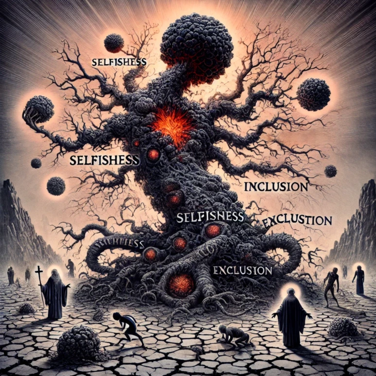 암세포는 처음에는 몸의 일부였다. 그러나 자기만을 위해 무한 증식하고, 주변 세포를 파괴하며 결국 온몸을 병들게 만든다. 종교도 마찬가지다. 공생을 잃어버린 순간, 그 속에서 이기심이라는 암세포가 자라난다. 이 암세포는 사람들을 배타적으로 갈라놓고, 신의 이름으로 폭력을 합리화하며, 약한 이들을 희생양으로 삼는다.