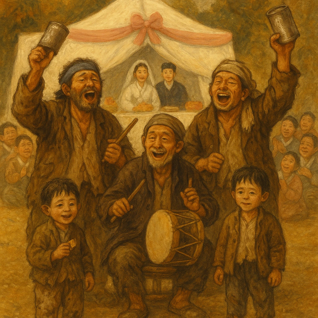 어쨌든 그 때는 구걸이 그렇게 부끄러운 일만은 아니었어. 귀동댁 자야 누나의 잔칫날 아침, 그들은 동네 초입에 있는 조섬 밖에서 깡통을 두드리며 각설이타령을 부르면서 동네로 들어 왔어.