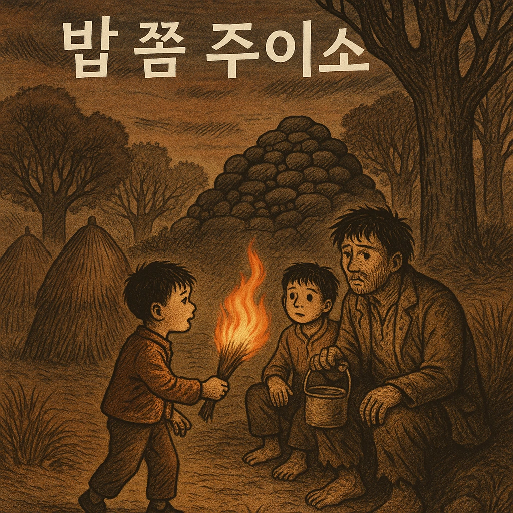 그리고는 냅다 집으로 뛰어왔어. 다음날 아침, 밥을 먹고 있는데 남루한 옷차림의 두 손님이 찾아왔어. 어른 하나, 아이 하나! ‘밥 쫌 주이소!’ 남자가 머리를 긁적이며 깡통을 내밀었지. 그래, 어젯밤 그 짚동 속 사람들이었어. 엄니는 말없이 먹던 밥과 반찬을 덜어 깡통에 담아주었어. 그들의 눈빛엔 감사와 부끄러움이 뒤섞여 있었지. 나는 아이에게 다가가 물었어.