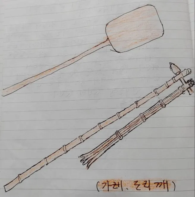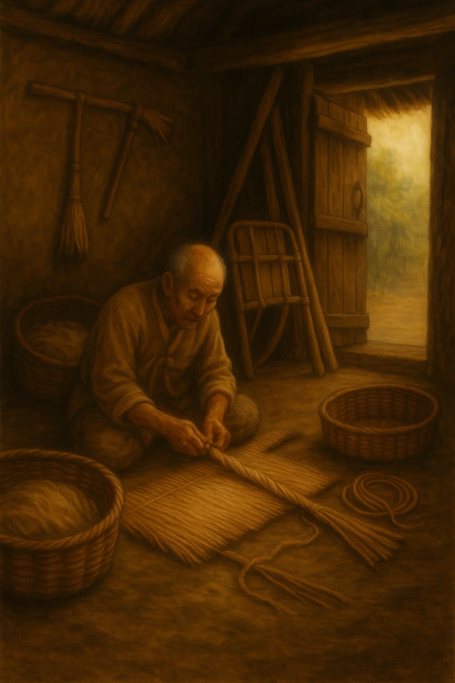 서노인은 말을 하면서도 손바닥에 침을 뱉으며, 부지런히 새끼를 꼬고 있습니다. 광의 안쪽에는 서노인이 만든 '덕석'과 '멍석', 지게와 지게에 얹는 '바자리', '싸리 소쿠리', 도리깨와 가래 등이 포개진 채 놓여 있습니다.