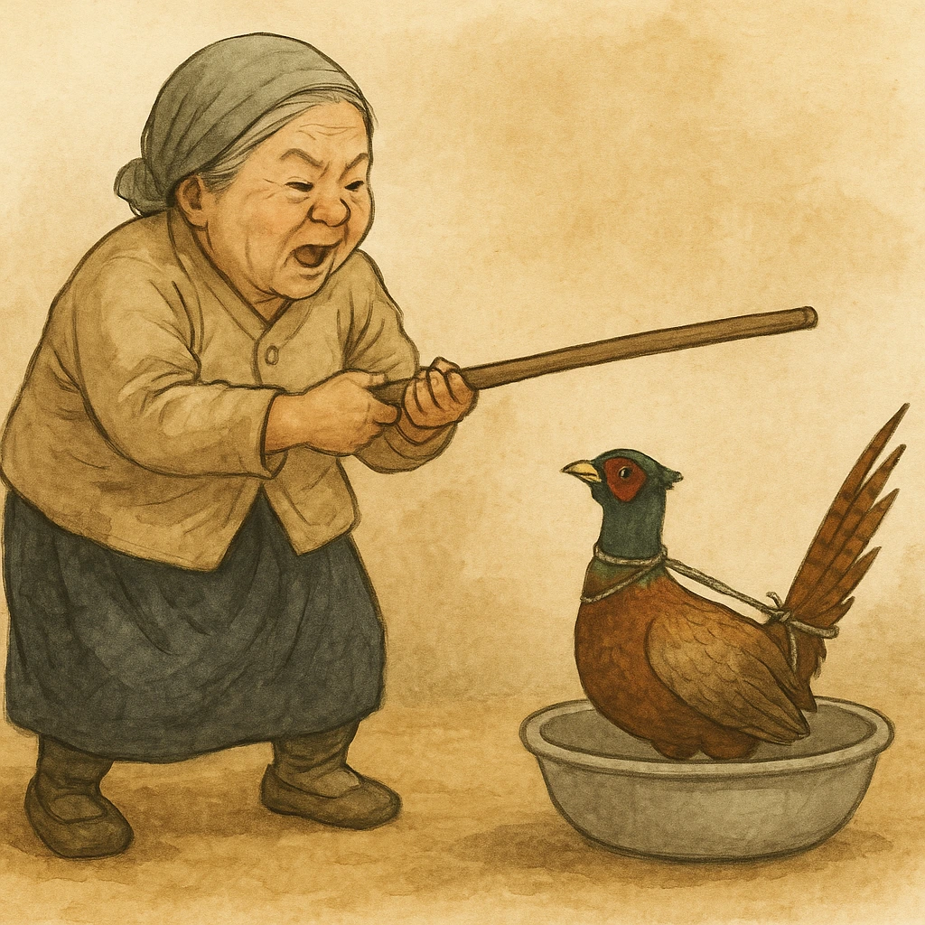 "할매! 성가가 돌팔매 질로 꿩을 잡았다 아입니꺼!"