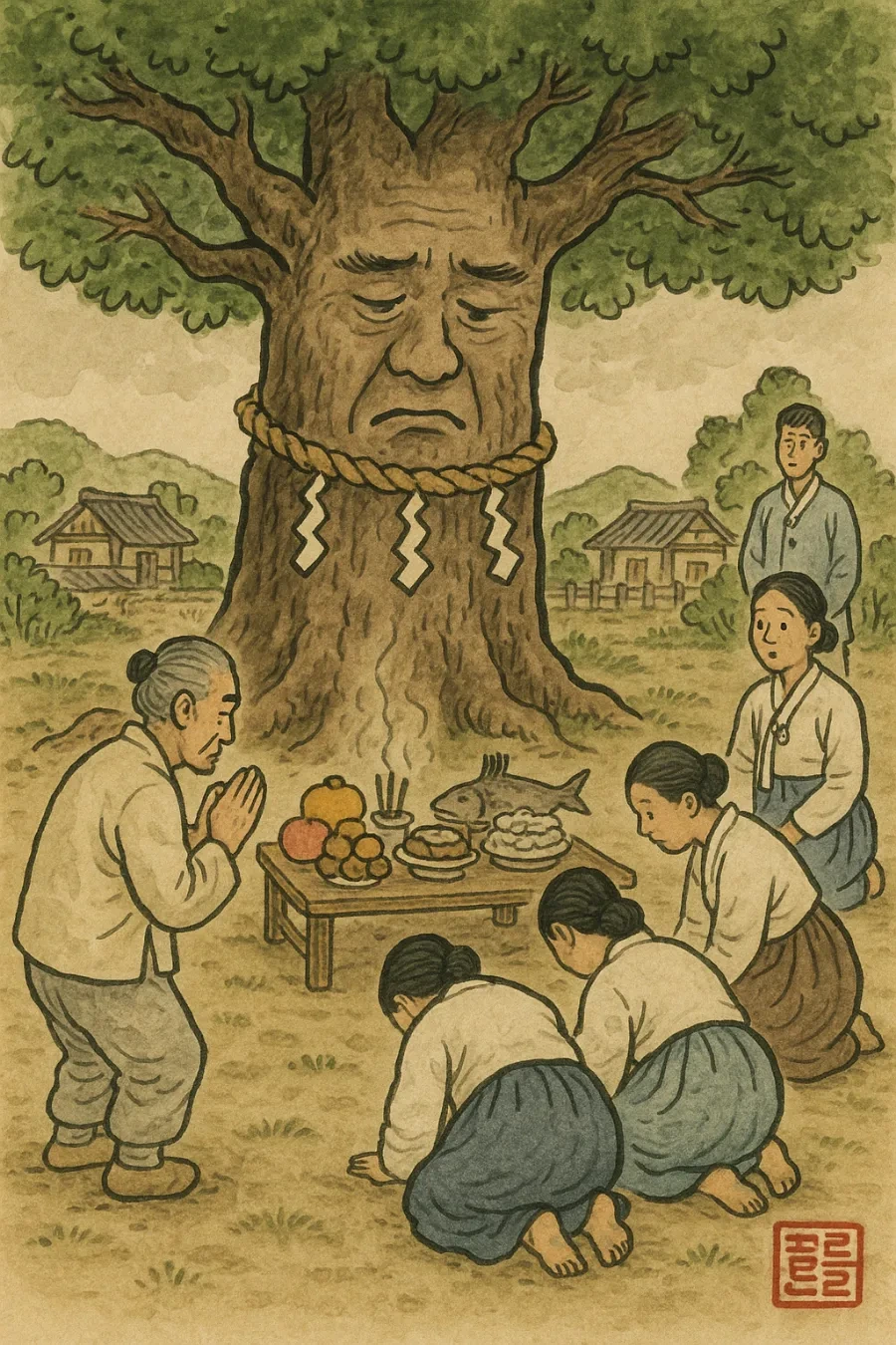 "엄니! 사람들이 왜 나무에다가 절을 하고, 제사를 지냅니꺼?"