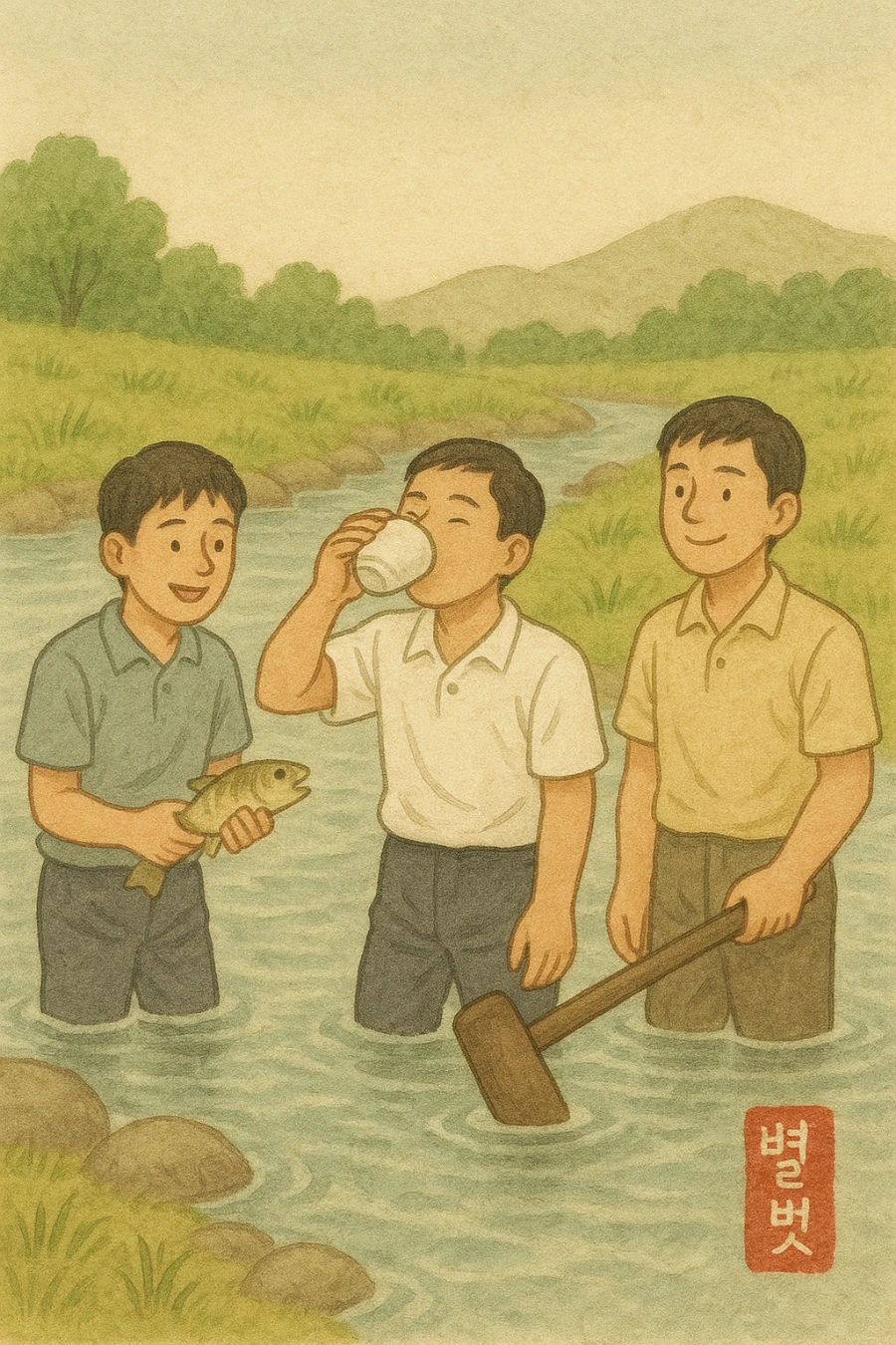 소주를 밥그릇에 붓고 한 모금에 들이켜. 원샷인데, 그 때는 그런 거 모르고 아까워서 쪽쪽 빨아 먹었어. 안주는 천렵한 고기를 손가락으로 내장을 쭉 훑어내고는 초(고추)장에 찍어 먹는 거야. 안주 맛이 입맛에 감돌면 다시 한잔을 따라서는 또 쭉 털어넣었지. 2병씩 가져간 댓병이 바닥을 드러내면 우리는 히죽 웃으며 바닥에 누웠어.