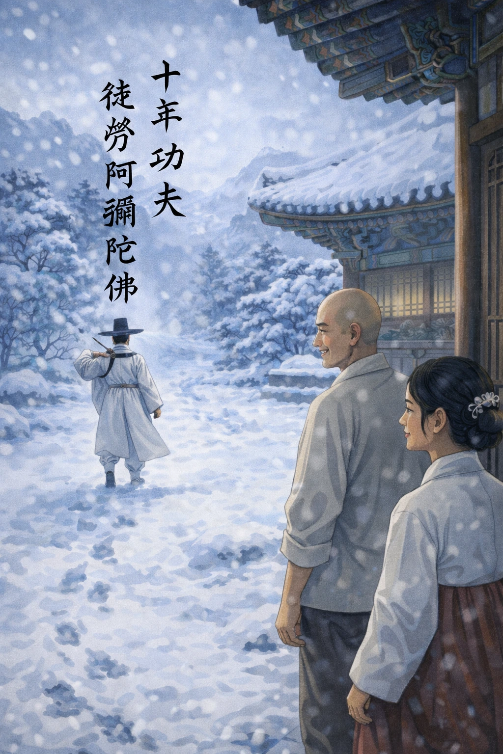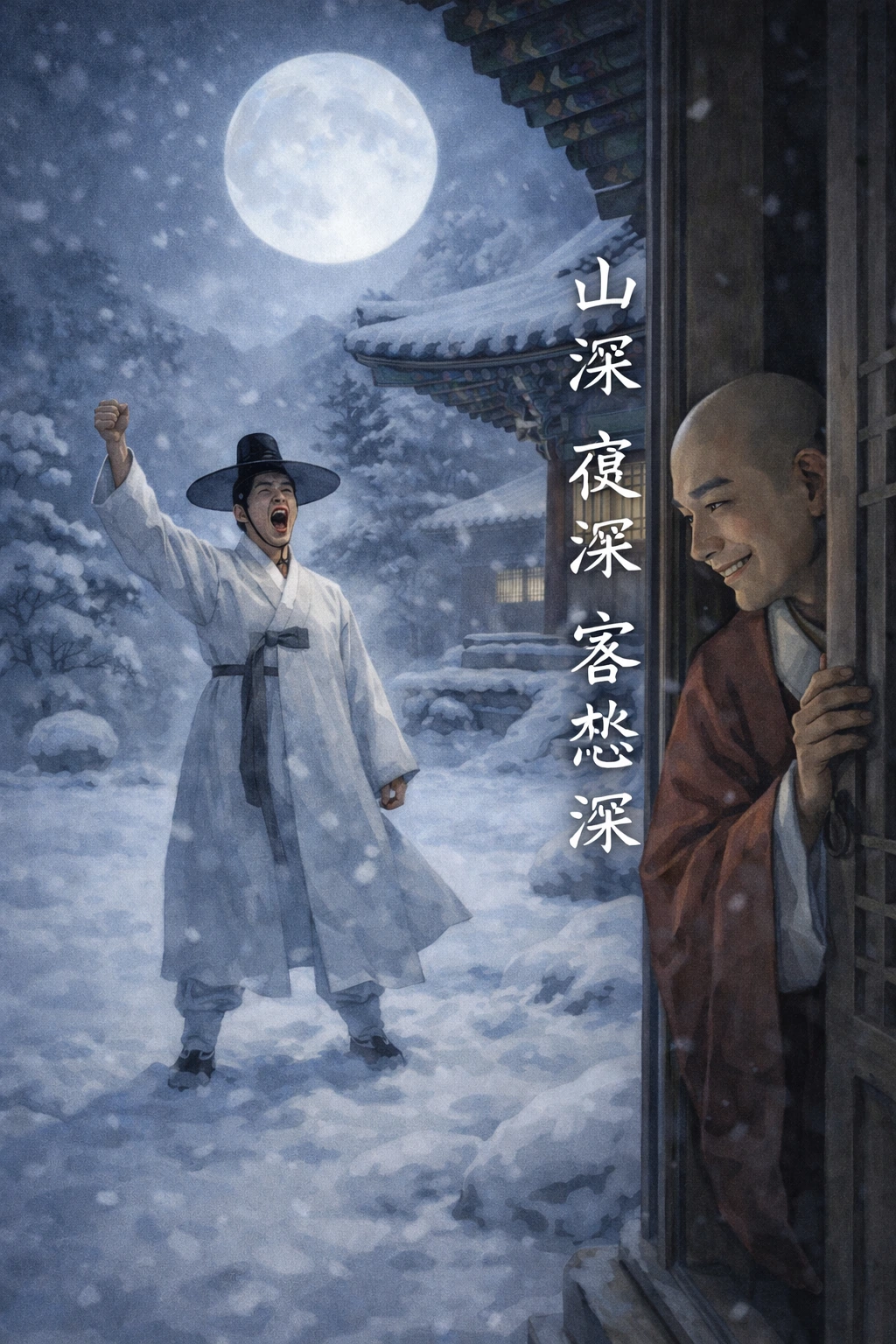 그날 밤에 남자는 가족들에게 학문을 정진하기 위해 떠난다는 서찰을 남기고 도로(徒勞)산에 있는 십년사(十年)샤로 떠났어요. 정진에 정진을 거듭해서 학문이 경지에 이르렀는데도, 댓구는 떠오르지 않았어요. 집을 떠난지도 10년이 되었어요. 그날도 떠나는 날처럼 산사 밖에 하얀 눈이 엄청 내렸어요. 남자는 창문을 열고 하늘을 보는데, 보름달이 엄청 밝게 빛나고 있었지요.
