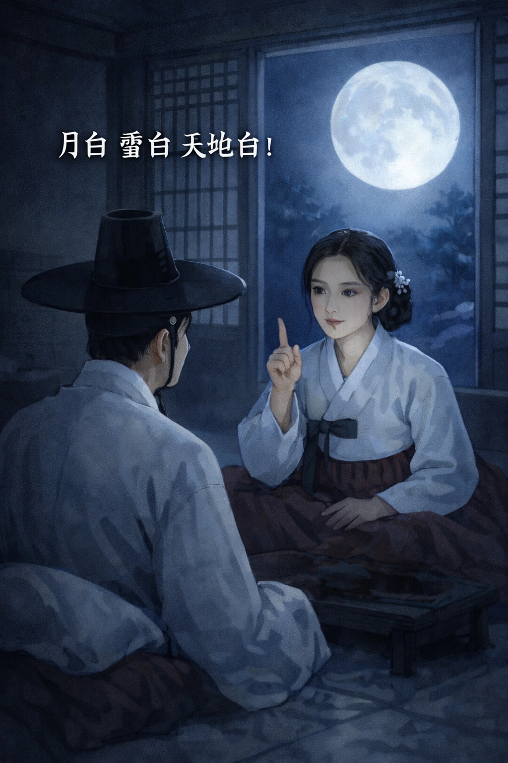 "서방님, 제가 시를 읊겠습니다. 월백 설백 천지백(月白 雪白 天地白)!"