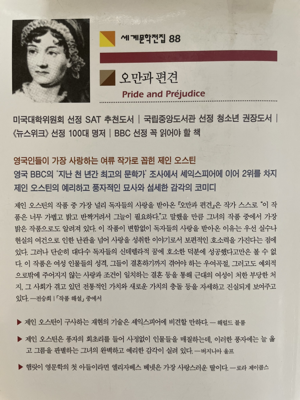 오만과 편견에서 엘리자베스는 다아시씨와 결혼한다. 신데렐라와 비슷한 스토리이지만 더 다채롭고 세련된 스토리다. 20세기 드라마의 주요 소재로 활용된 것의 원조, 예를 들면 별은 내 가슴에, 시크릿가든, 내 딸 서영이, 파리의 연인 등의 시나리오에 영감을 준 원작 스토리다. 하지만 제인 오스틴 그녀는 평생 결혼하지 못했다. 너~~무 아름다운 작품을 남겼지만 본인의 삶에서는 현실이 되지 못했다. 역사상 영국인들이 가장 사랑한 작가인 그녀는 그렇게 아침 이슬처럼 서둘러 사라졌다.