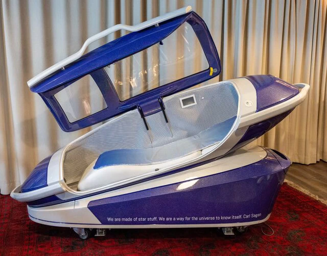 '사르코'는 사람이 한 명 들어갈 정도의 크기를 가진 자살 조력 캡슐 장치이다.