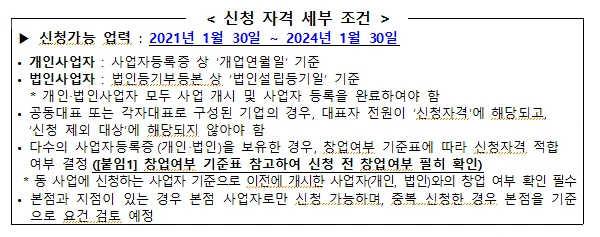 중소기업창업 지원법 제2조 2호 및 3호, 제10호에 따른 초기 창업기업의 대표자로서 모집공고일 기준 창업 3년 이내인자 의 "신청 자격 세부조건" 안내이렇게 신청 세부자격요건을 고지한다.