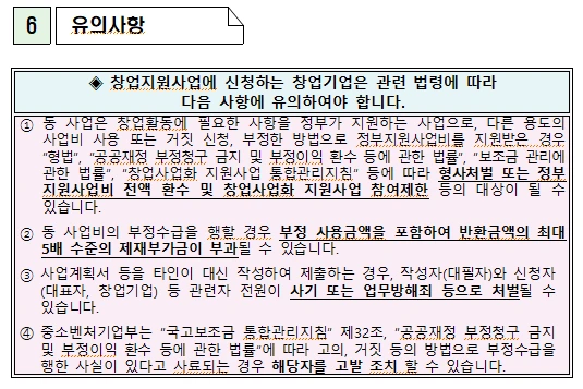 고의 또는 과실로 타인의 사업계획서를 모방하거나 표절하여 도용하고 신청하는 경우는 지원사업의 참여제한을 3년간 하며 정부지원사업비 전액환수 및 기타 제재가 끊임없이 주어진다.