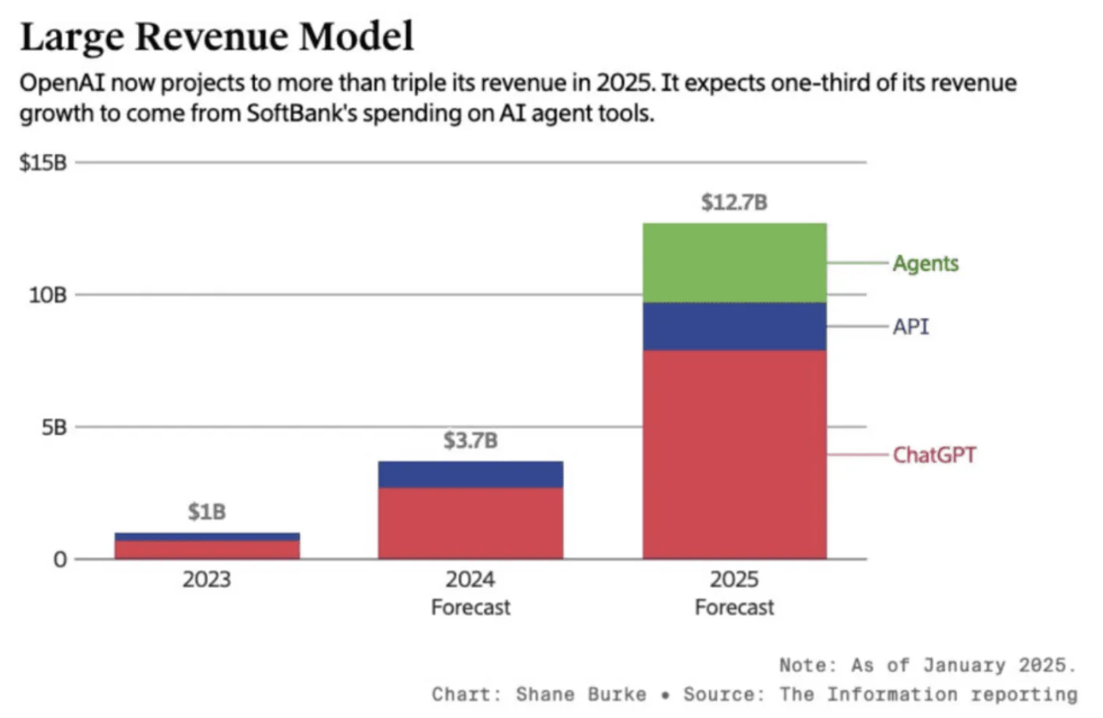 이렇게 유료 구독만으로도 OpenAI는 연간 매출이 2022년에는 2억 달러, 2023년에는 22억 달러, 2024년에는 37억 달러(4조 8천억 원)에 이르렀다. 심지어 올해에는 127억 달러(16.5조 원), 내년에는 294억 달러(38.2조 원)를 찍을 것으로 예상된다.