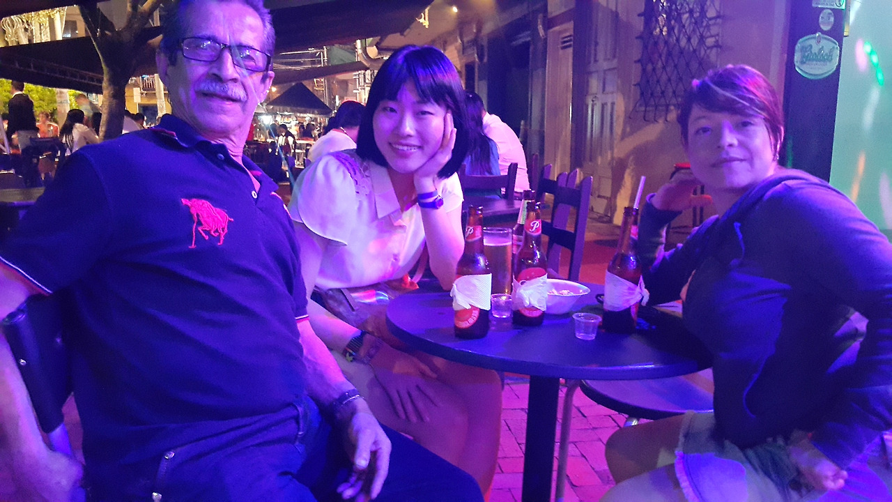 대충 식사를 때우고 나서, 살사가 나오는 바 bar의 야외테이블에 앉았다. 맥주를 시키고 앉아있는데, 옆 테이블의 남자 셋이 계속 말을 건다. 카탈리나가 그들에게 매우 관심을 보였다. 호스텔에선 본 적 없는 화사한 미소.
