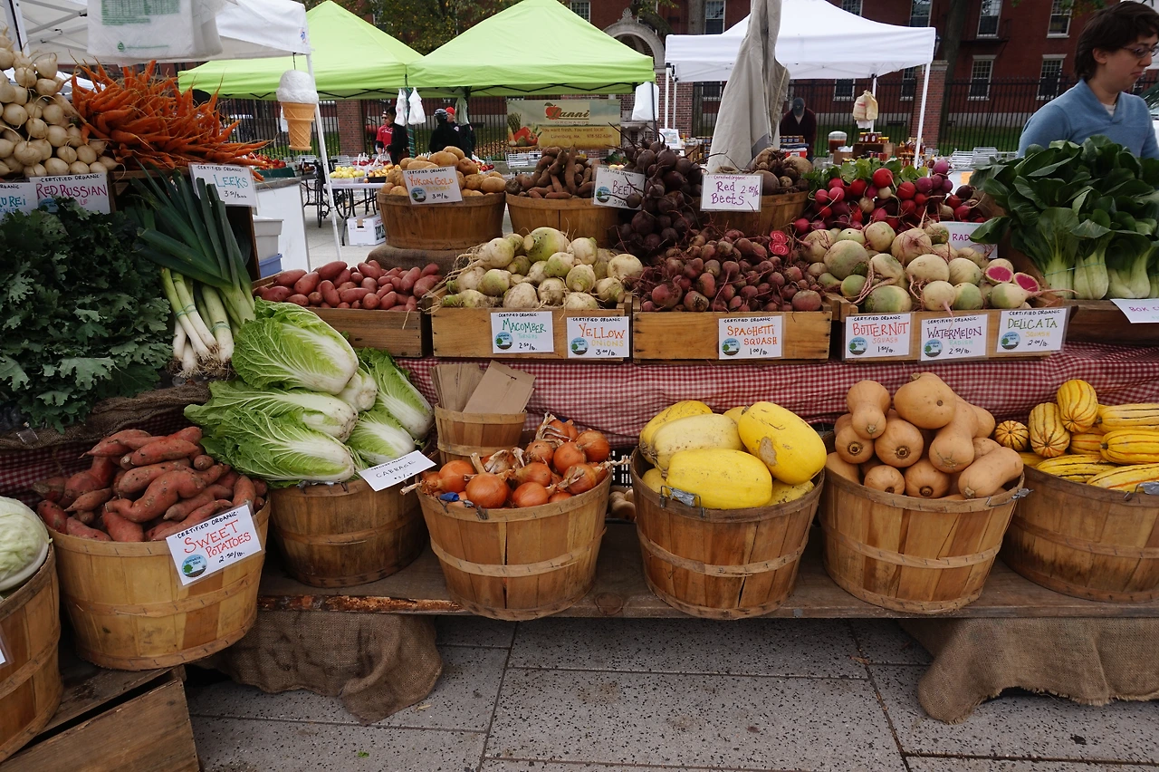 <사진 2> 뉴욕의 노점- 채소코너. 우리와 같은 이름의 농산물이어도 모양과 크기가 달라, 구경하는 재미가 있다.