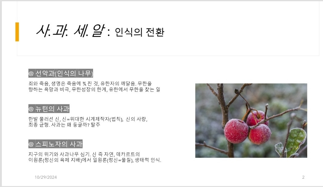 세 번째 사과도 잘 아시는 것처럼 스피노자의 사과입니다. 마르틴 루터가 했다는 이야기도 있지만 “내일 지구의 종말이 오더라도 나는 한 그루의 사과나무를 심겠다”는 말은 유명합니다. 이는 당장 지구가 망하더라도 마지막까지 최선을 다하겠다는 인간의 의지와 자세를 의미하겠지요.