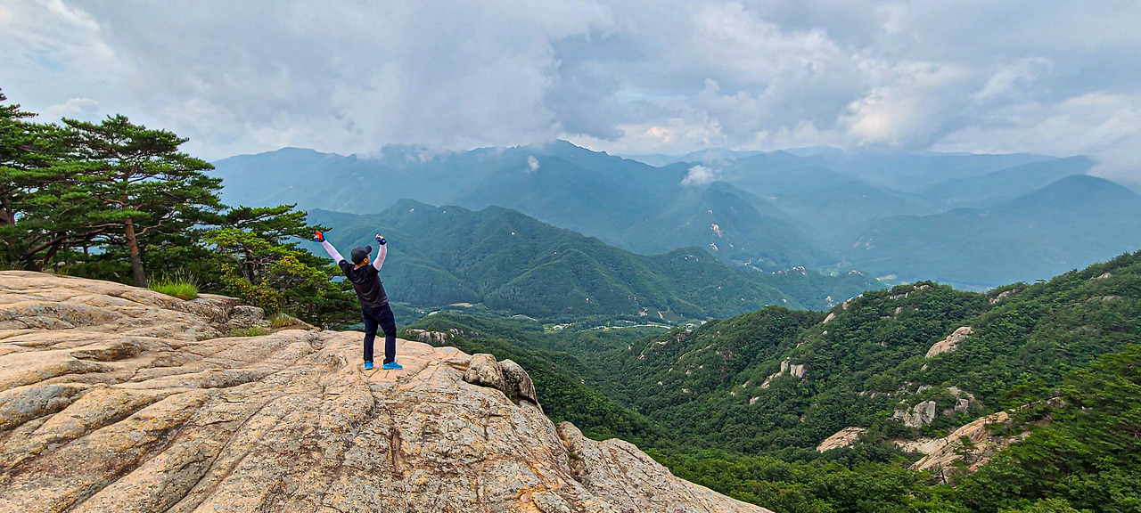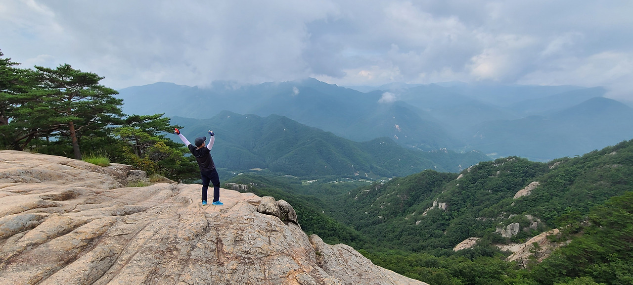 산에 오르면 날씨가 어떻게 변할지 모르니 주의하라는 얘기를 종종 듣곤 한다. 오늘은 좋은 쪽으로 변했다고 할까? 정상에 머물러 있는데 조금 전까지 금방이라도 비를 쏟을 것 같던 하늘에 해가 나기 시작했다. 파랗게 하늘이 열리니 조금 전과 다르게 풍경이 좋아진다. 다만 열기도 같이 후끈해졌다. 하늘이 열린 신선봉의 풍경이 궁금해서 발걸음을 서둘렀다.