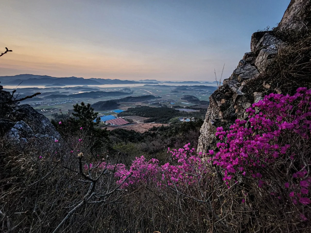 랜턴에 의지해 어둠 속을 오르는 산행은 주변 풍경을 보지 못한다는 점이 단점이면서 장점이 되기도 한다. 오르면서 봐야 할 풍경이 많다면 단점이겠지만 무념무상 산행을 하고 싶다면 장점이 된다. 걷고 또 걷다 보니 어느덧 여명이 밝아왔다. 캄캄했을 때 보이지 않던 진달래도 조금씩 모습을 드러냈다.