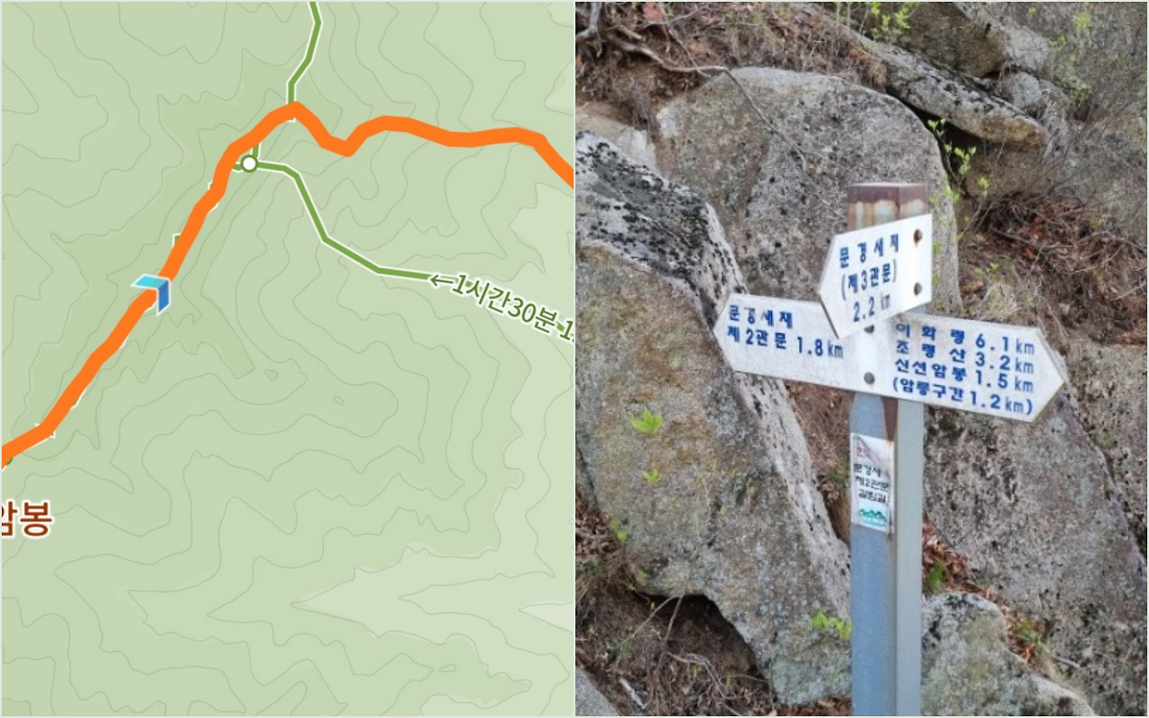 신선암봉에서 가파른 내리막을 내려오면 문경새재 꾸구리바위로 하산하는 첫 번째 갈림길이 나온다. 여기서 꽤 고민을 했다. 체력이 완전히 바닥은 아닌데, 앞으로 올라야 할 구간도 바위를 타야 할 구간도 많다. 물론 그런 점 때문에 이 코스로 산행을 계획했다. 그리고 몇몇 후기에 이 코스 하산길에 꽤 험하다는 평이 있었다. 고민 끝에 조금 더 가보기로 했다.