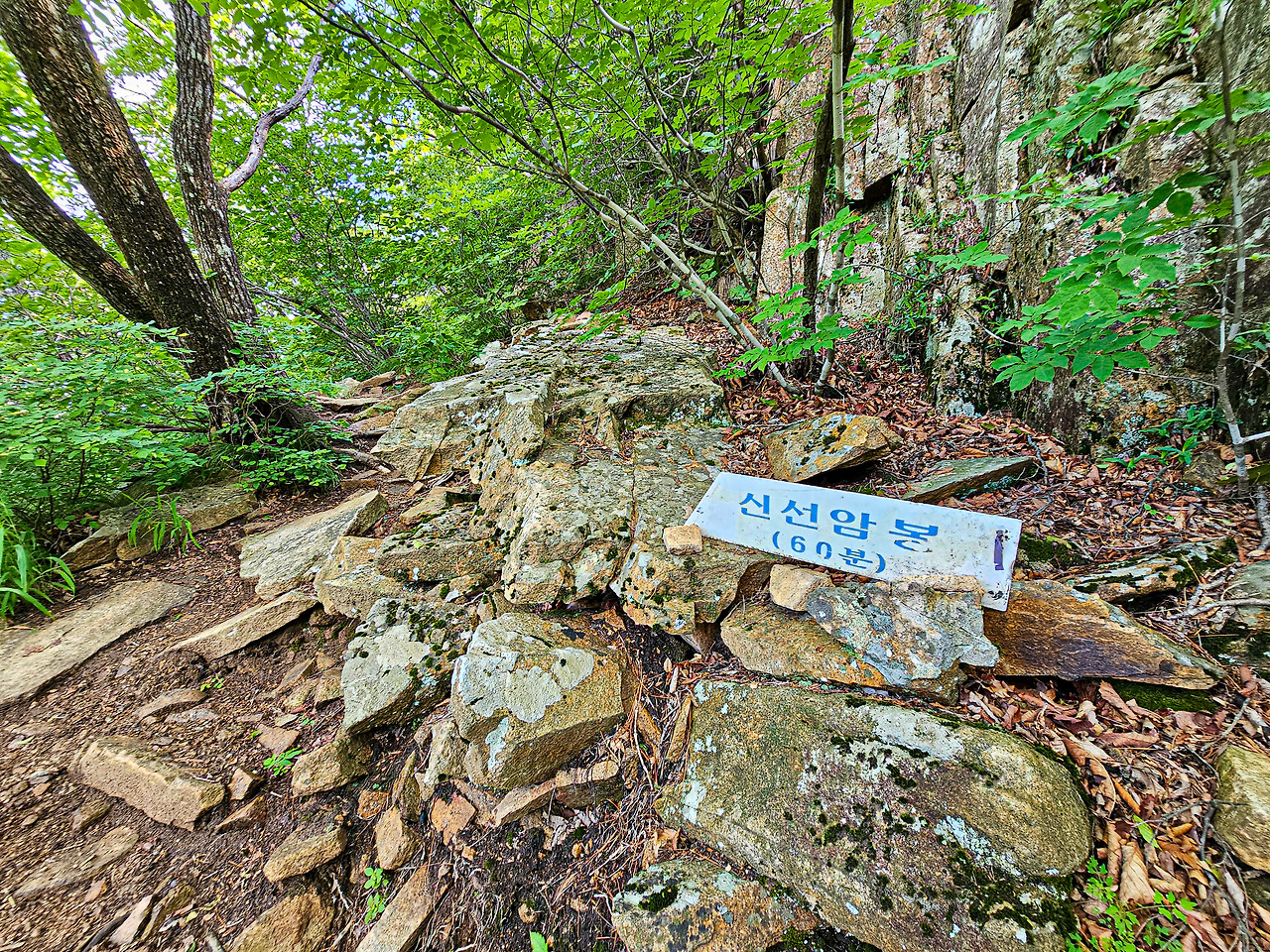 정상에서 신선암봉 방향으로 산행을 이어간다. 무성한 나무사이로 내려가다 보면 뭐가 보일까 싶다.