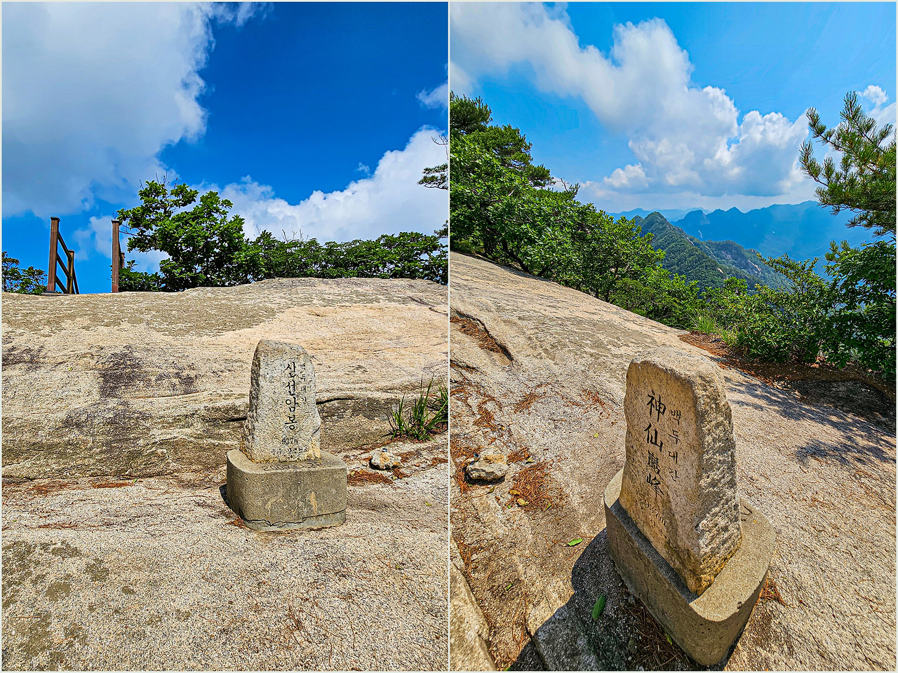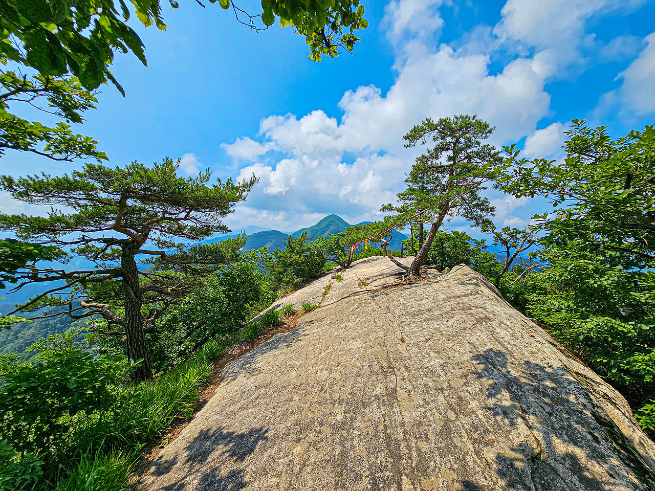 신선암봉 정상은 마당바위처럼 넓은 편이다. 여기서 잠시 쉬려고 했는데 그늘이 너무 없어서 마땅치 않았다. 위에서 내리쬐는 햇볕도 따가웠지만 바위에서 올라오는 열기도 만만치 않았다. 오래 머무르지 못하고 깃대봉 방향으로 산행을 이어갔다.