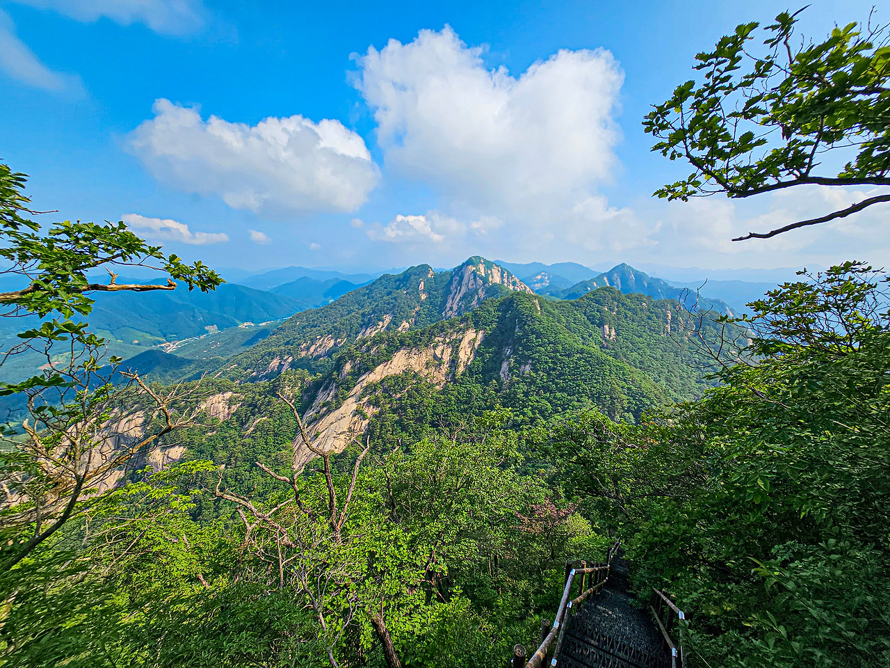 946봉을 지나면 다시 아까와 같은 급한 내리막 계단이 나온다. 이 계단을 내려가며 보이는 신선암봉은 정말 장관이다. 아까와는 조금 다르게 신선암봉의 밑동까지 보인다. 정말 신선이 머무를 것만 같은 풍경이다. 깊은 숲 속 다른 세상으로 들어가는 듯한 느낌을 받게 된다. 한 계단 한 계단 천천히 발을 디뎠다. 계단이 가팔라서 한 걸음 내딛을 때마다 조심스럽기도 하지만 속도를 낸다고 이 풍경을 가볍게 스쳐가는 게 아깝기도 했다.