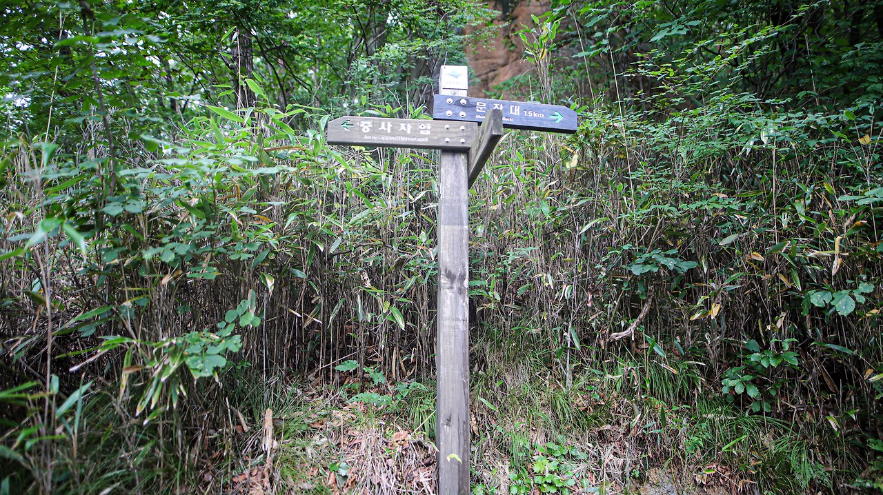 조금 더 오르면 중사자암 갈림길이 나온다. 문장대 아래에 있는 사자암은 상사자, 중사자, 하사자 세 암자가 있었는데 상사자암과 하사자암은 90여 년 전에 폐허가 되고 중사자암만 남아있다고 한다. 바위 모양이 사자와 같아 사자암이라고 칭했다고 한다. 정상을 오르기도 빠듯해 갈림길 초입만 조금 슬쩍 보고 지나쳤는데, 사자 혹은 개를 닮은 바위가 보이기는 했다. 사자암의 유래가 된 바위일지는 모르겠다.