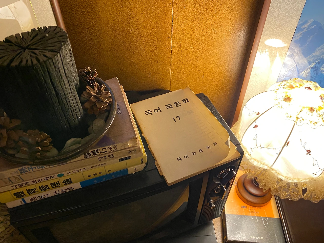 방 한쪽 구석, 낡고 오래된 전자레인지 위에 책 한 권이 놓여있다.