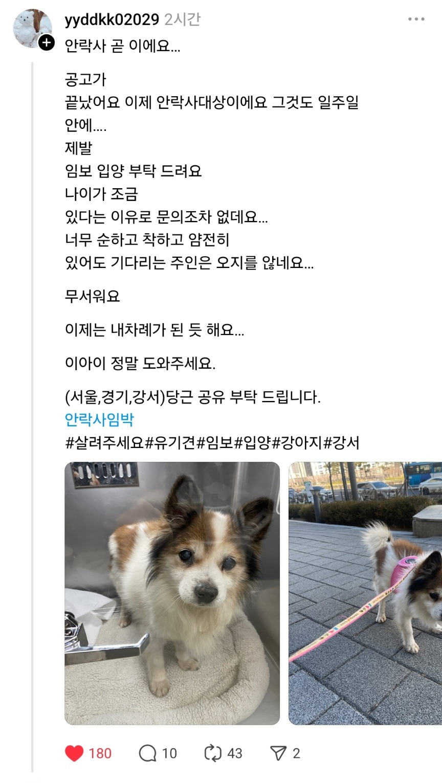 다행히 한 분이 입양 신청서를 작성하셨고 다음 주에 강아지를 데리러 가기로 하셨단다. 하지만 본인도 오래 데리고 있을 수 없으니 입양처를 찾을 수 있게 기도해 달라는 말을 남기셨다.