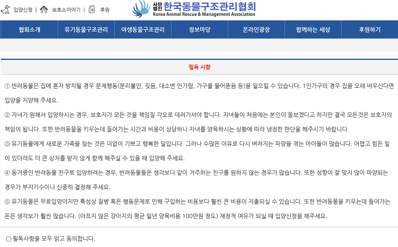 입양 신청서를 쓰기 전에는 다섯 가지 필독 사항에 동의를 해야 한다. 그것은 매우 기본적이면서도 무거운 것들이라 하나라도 마음에 걸리면 머뭇거릴 수밖에 없다. 그러나 반려 동물을 입양하겠다는 큰 결정 이후에 삶을 더 행복하고 풍요롭게 삶을 살아가는 이들이 많다. 강아지를 무서워하던 내가 강아지에게 위로받고, 말 못 하는 동물에게 도움을 줄 수 있는 사람으로 성장할 수 있기를 바라게 된 것처럼. 유기견 한 마리를 보며 마음 아파하는 나보다 동물구조 관리협회야말로 말도 못 하게 힘든 경우가 많겠지만, 그렇기에 입양으로 열리는 긍정적인 세상에 대해서도 언급해 주면 좋지 않았을까 하는 아쉬움이 들었다.