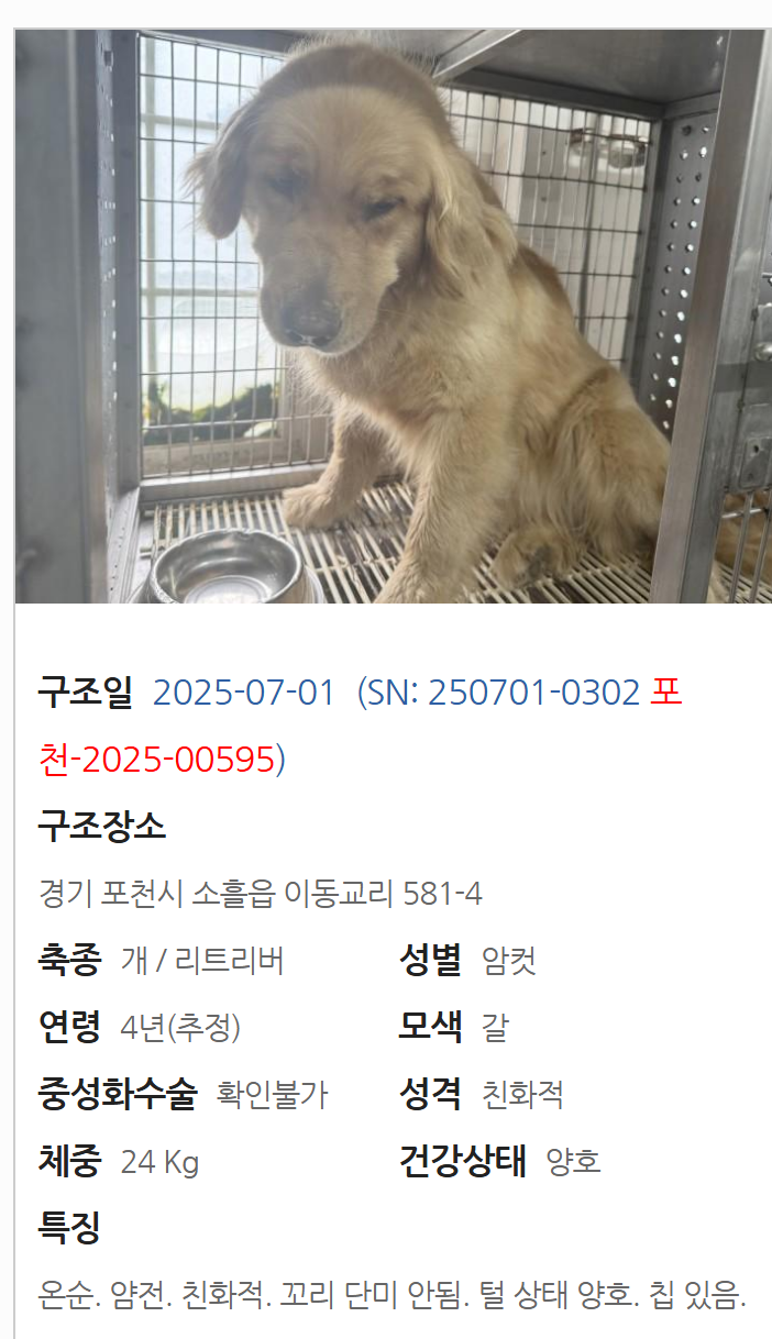 며칠 뒤 올라온 포스팅에는 현재 포천시 보호소에 슬픈 표정으로 몸을 구부려 앉아 있는 리트리버의 모습이 있었다. 이름도 사연도 없이 보호소 등록 번호로만 불려지고 있을 그 아이. 직접 구조해서 한 시간 넘게 몸을 쓰다듬어 주던 로이드 실장님은 얼마나 마음이 쓰일지 가늠조차 되지 않는다. 아마 그분의 하루하루, 매 시간이 이 아이를 데리고 오지 못한 무거움으로 점철되고 있을 것이다.