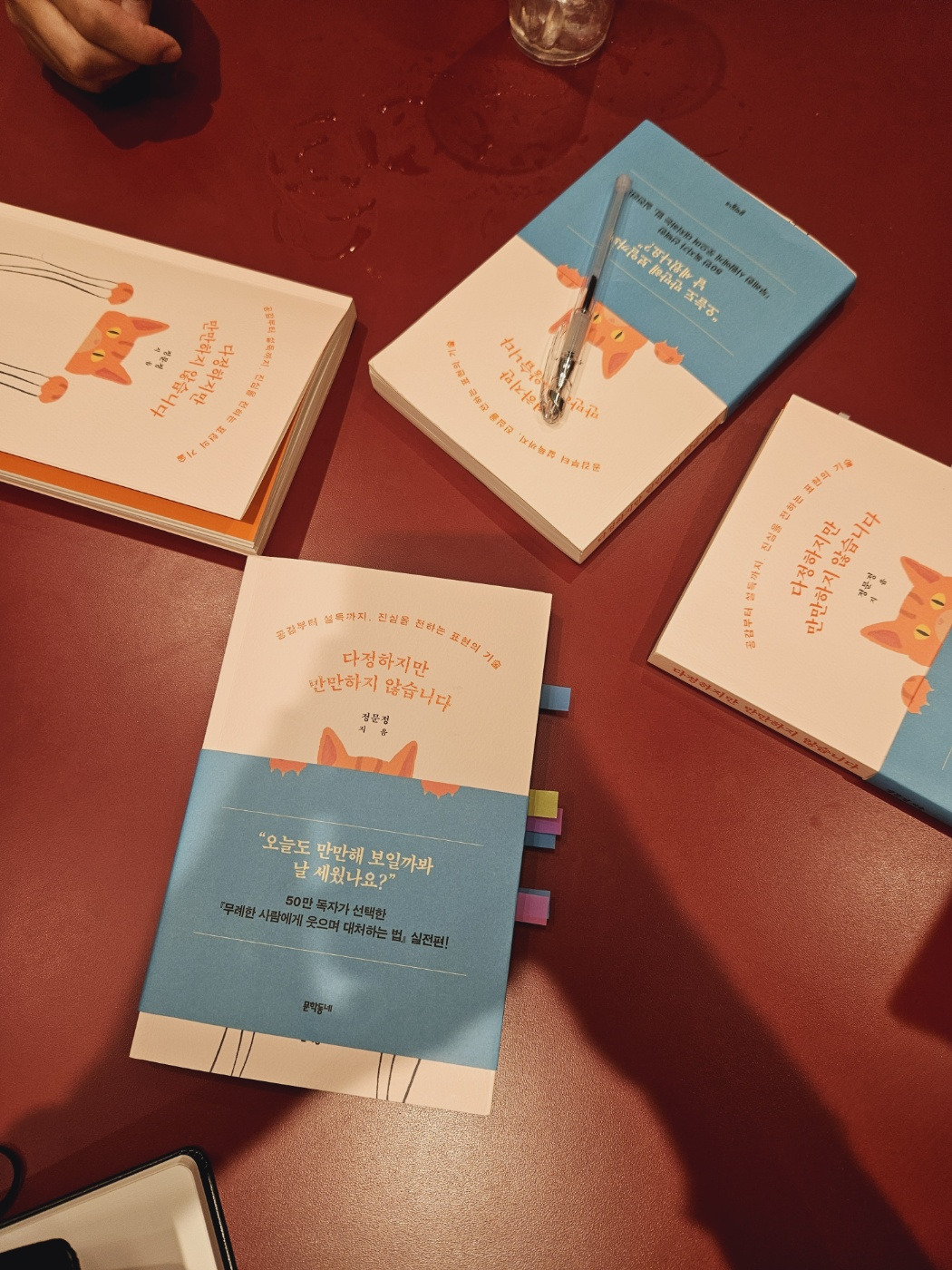 그러나, 어제의 독서모임을 하고 나서는 챗GPT가 독서모임만큼은 위협하기 어렵겠다고 느꼈다. 독서 모임은 여러 사람과의 대화를 통해서 생각의 범위를 넓히고, 나 자신을 향한 사유를 돕는다. 어제의 책은 정문정 작가의 '다정하지만 만만하지 않습니다.'였는데, 좋은 에세이라면 나의 치부, 혹은 트라우마(책에서는 소변 주머니로 표현)를 드러내야 한다는 대목이 있었다. 그 대목과 관련하여, "당신의 소변 주머니는 무엇인가요?"라는 질문이 나왔고, 처음으로 얼굴을 보는 사람도 있는 자리에서 깊이 묻어둔 트라우마를 꺼내기가 쉽지 않은 상황이었다. 그런데 바로 대답이 이어졌고, 어느 순간 자신의 트라우마에 대해서 이야기를 나누고 있었다. 정신과에 가서 돈을 내고 상담을 받는 이유와 비슷하게, 어쩌면 우리는 약간의 거리가 있는 사이에서 내밀한 이야기를 더 잘 꺼낼 수 있는 지도 모르겠다.