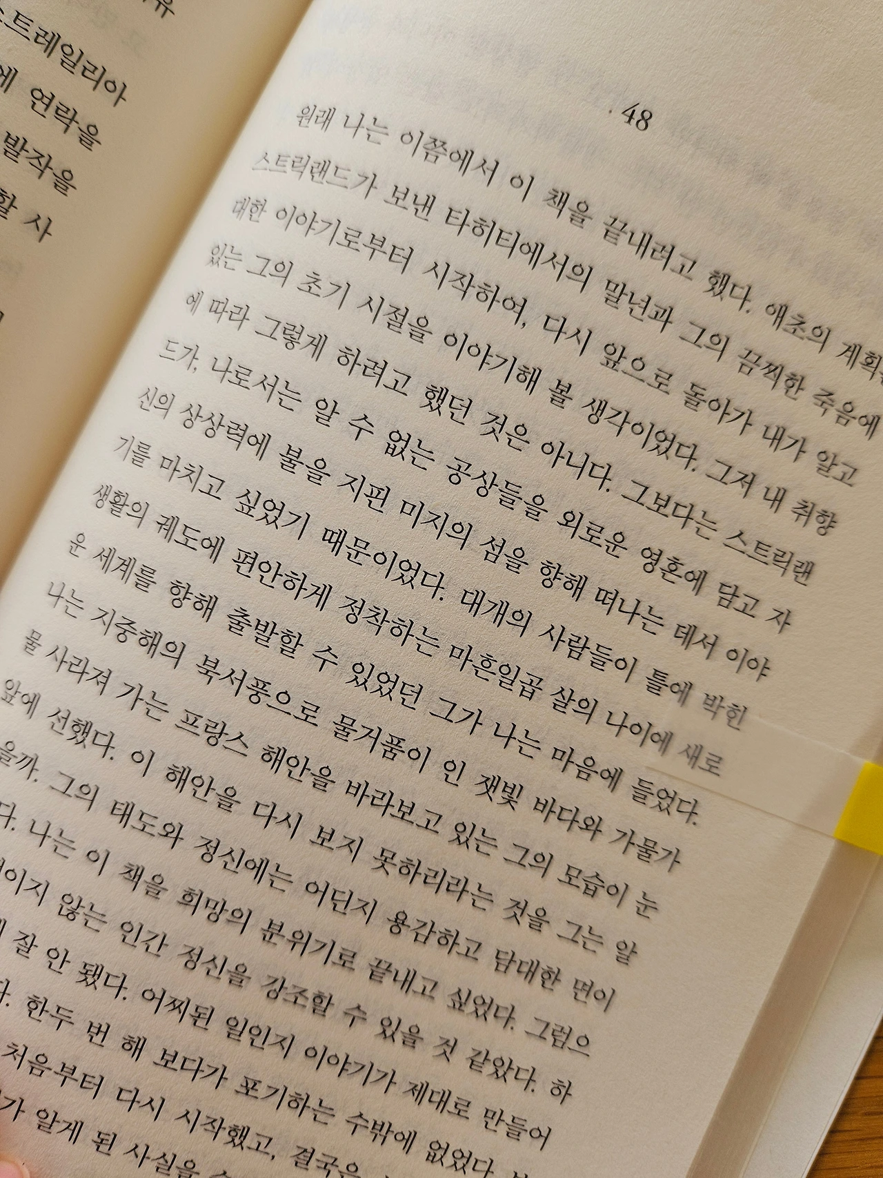 고전을 읽으면 고전한다. 그 과정에서 고전은 사유할 거리를 준다. 독서 모임에서 주기적으로 고전을 선정하는 이유도 그 때문일 것이다. 책의 첫 페이지를 펼치고, 내용에 몰입하기까지는 시간이 걸리지만 끝까지 읽어내면 고전이 왜 이렇게 여러 세대에 걸쳐서 살아남았는지를 느낄 수 있다. 최근의 모임에서는 서머싯 몸의 '달과 6펜스'를 다뤘다. 좋았던 페이지에 인덱스 스티커를 붙인 것을 보고 참석하신 한 분이 "수능 공부하세요?"라고 물었는데, 그만큼 인상적인 문장이 많았던 책이었다. 아래 발췌는 민음사 버전을 활용했다.