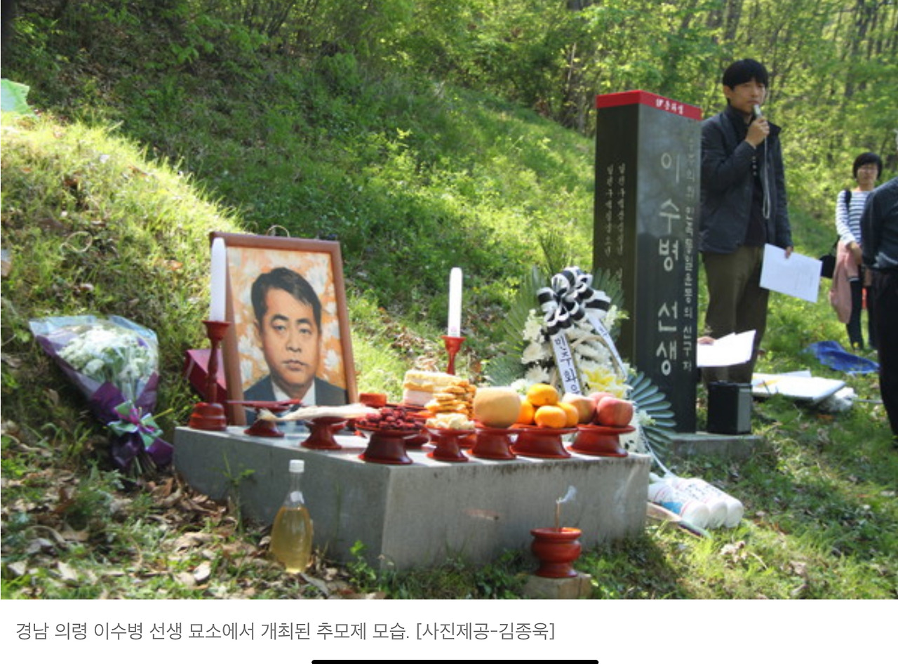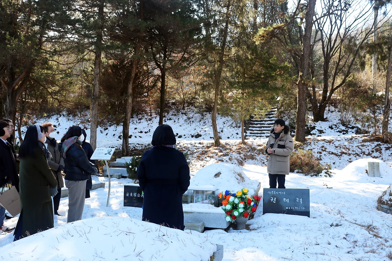 (마석 모란공원 청소와 정리를 20년째 하고 있는 김종욱. 사진은 참석자들에게 망자의 생애를 설명하는 모습)