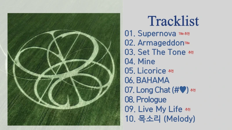 먼저 앨범의 선공개 타이틀인 <Supernova>가 모습을 드러낸다. 데뷔곡 <Black Mamba>부터 시작하여 <Drama>까지 이르러 팬들 사이에서 소위 '쇠맛'이라고 불리게 된 특유의 신스 사운드를 토대로 하되 여기에 <Spicy>의 경쾌함을 더해 진입 장벽을 낮추었다. 음악이 지향하는 목표와 대중성이 절묘하게 맞아떨어진 곡으로 특히 브릿지 이후의 전개는 곡이 끝나는 순간까지 듣는 재미를 더한다.