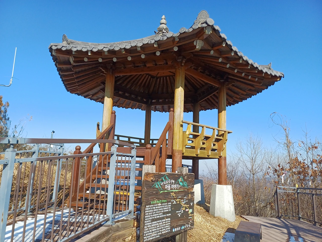 생각 끝에 보덕산 정상에 닿았다. 안내판을 보니 여기가 한남금북정맥의 줄기이며, 보덕(普德)이라는 이름처럼 넓은 덕을 품어 ‘큰산’이라 불린다는 것을 알게 되었다. 이곳은 반기문 전 유엔사무총장 생가와 이어지는 ‘비채길’ 테마공원으로 조성되어 있었다. 팔각정은 나에게 자리를 통째로 내어주며 쉼을 권한다. 산 아래 풍경을 바라보며 잠시 묵상에 잠긴다.