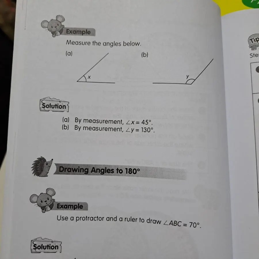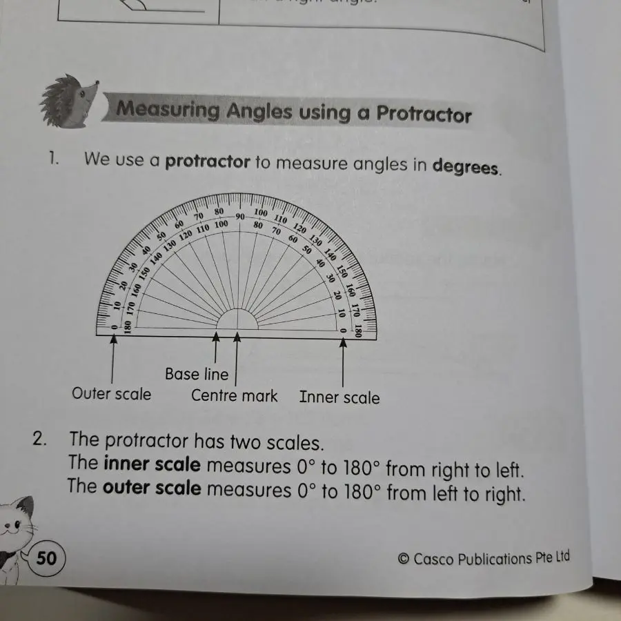 그리고 아이들이 제일 어려워하는 각도재는 법을 설명하고 예시를 보여준다. 용어를 그림과 함께 설명해 줘서 아이가 이해를 더 잘할 수 있었고 예시 문제를 함께 연습할 수 있어 더 유용했다.