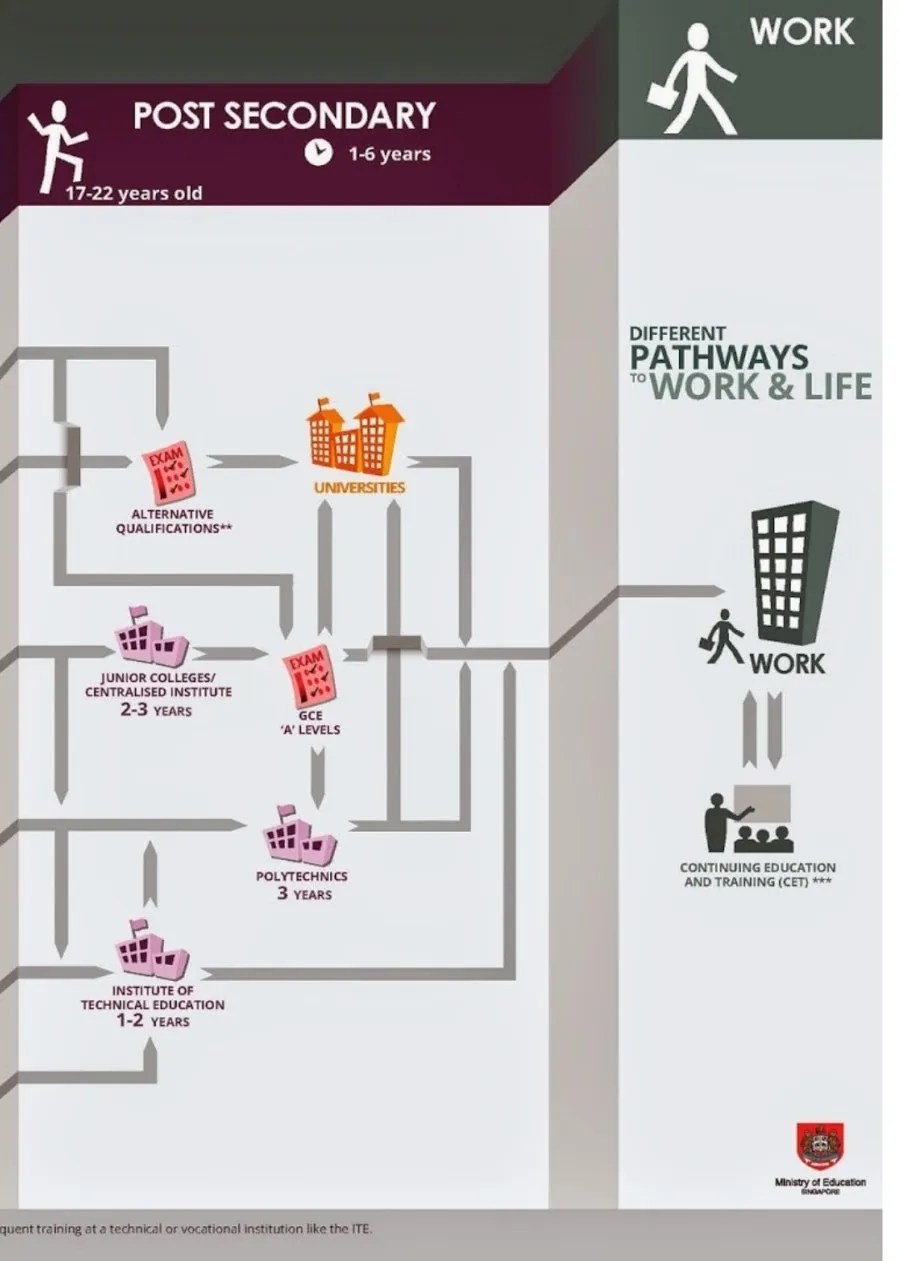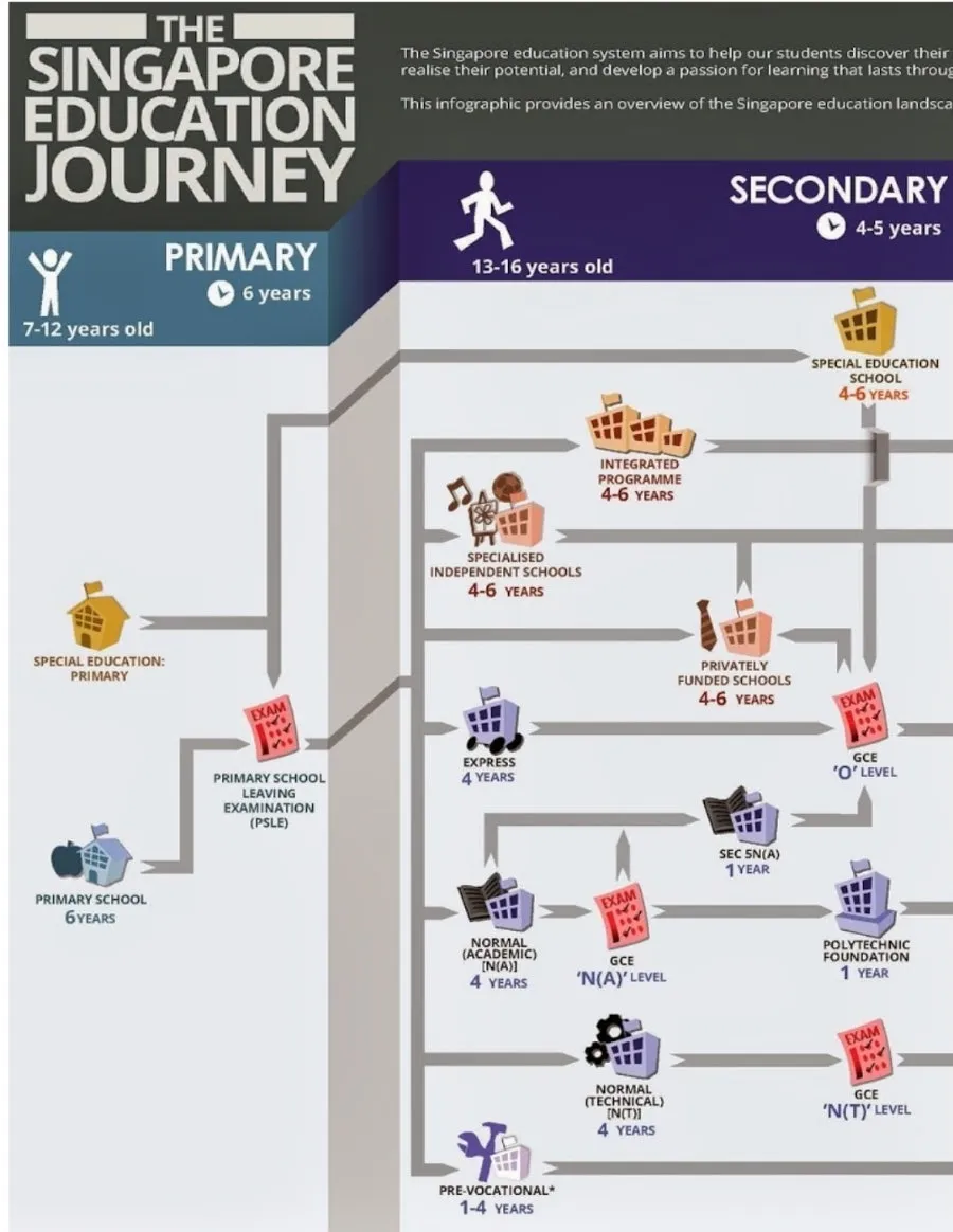 싱가포르는 6세부터-15세까지 의무교육이다. 초등 6년 후 PSLE라는 졸업시험을 보는데 대학이 이때 결정된다는 말이 있을 정도로 중요한 시험이다. Secondary부터 직업학교에 가는 아이들이 생기기 때문이다.