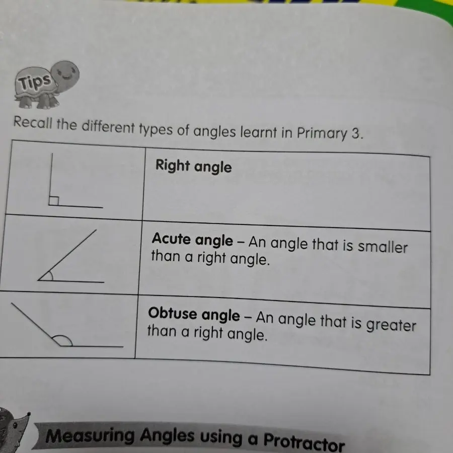 각도 단원을 예를 들어 설명하자면 일단 각도에 대하여 Naming을 해준다. 그 예시를 보여주고 직각, 예각, 둔각 용어 설명을 해준다. 이 용어를 못 알아들어서 문제를 못 푸는 경우가 있었다.