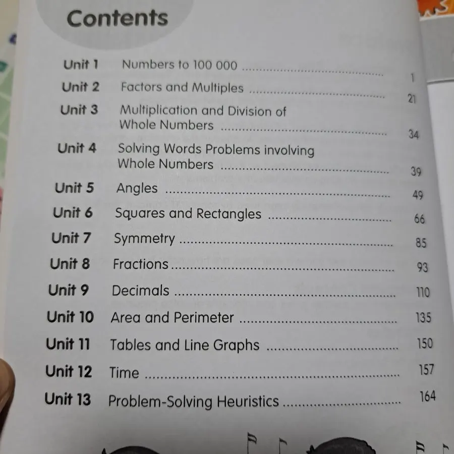 단원 구성을 보면 4학년 국가 수학 교육과정이 우리나라와 거의 비슷하다. 큰 수로 시작해서 각도, 분수 등을 배운다. 자료해석이나 시간 등도 포함되어 있었다.