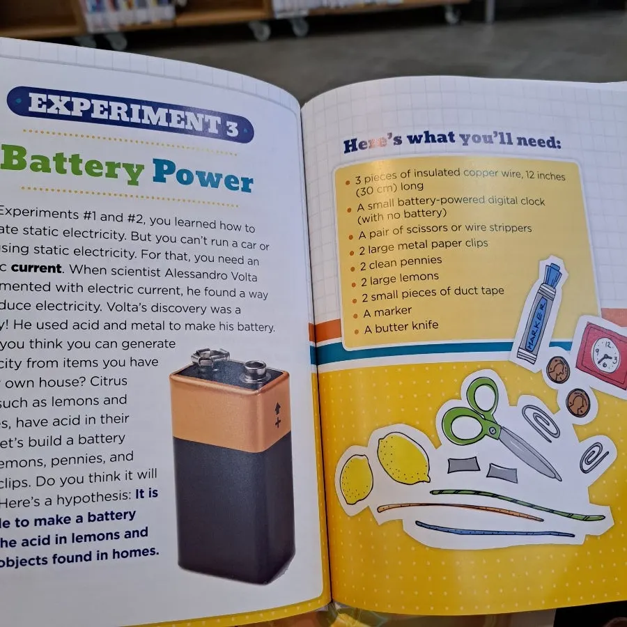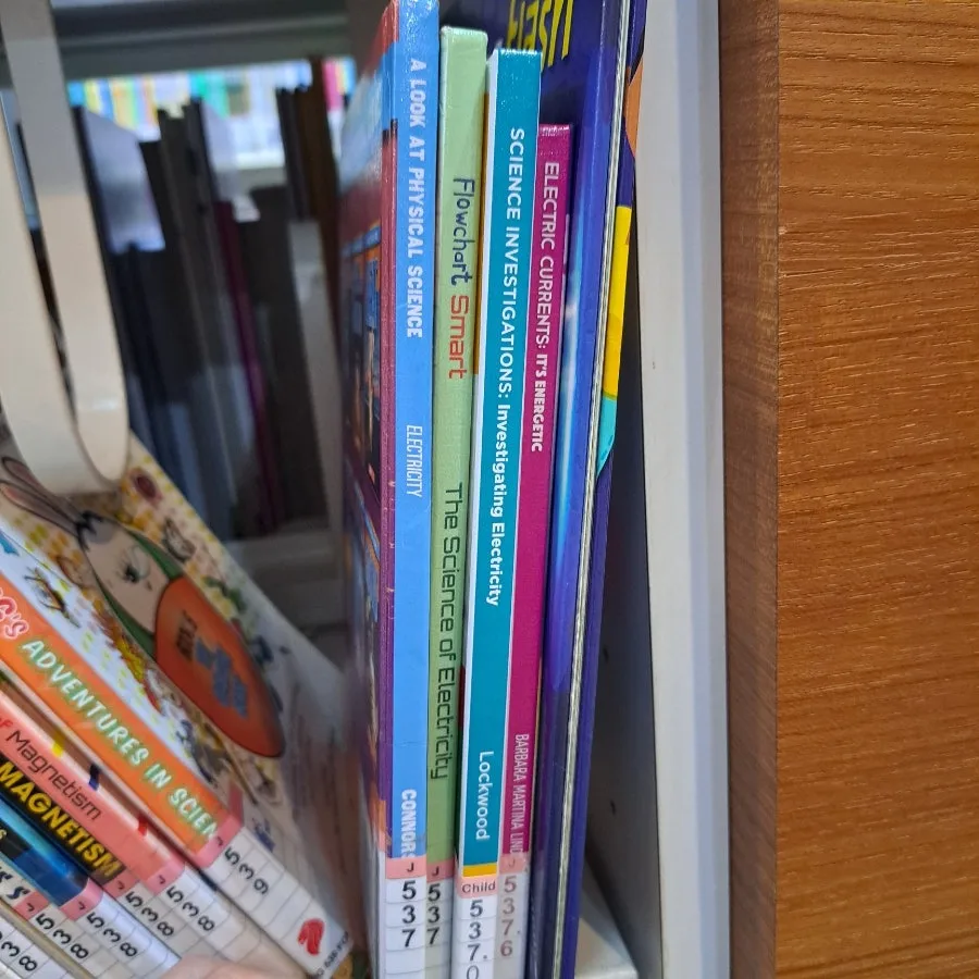 동네 어린이도서관 서가는 장르별 뿐만 아니라 연령별로 구획되어 있어 영어책을 고르기가 너무 편했다. 전기는 530번 대의 Physics에 정리되어 있었다.