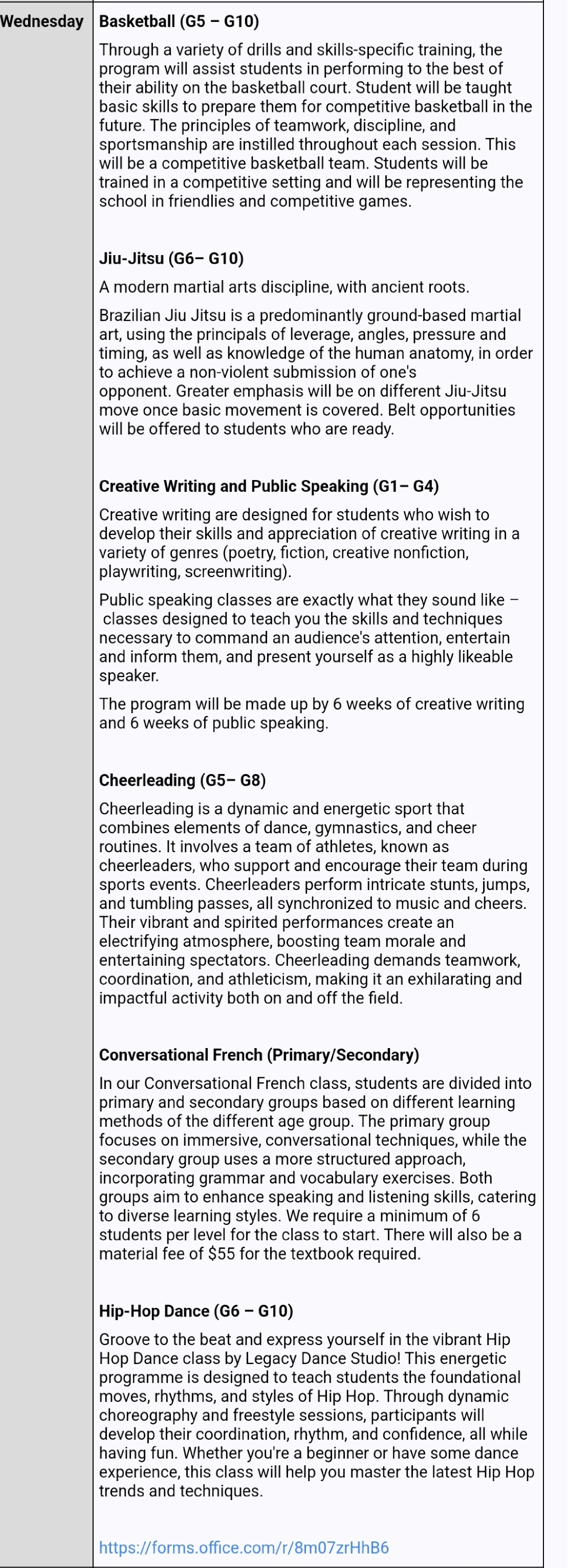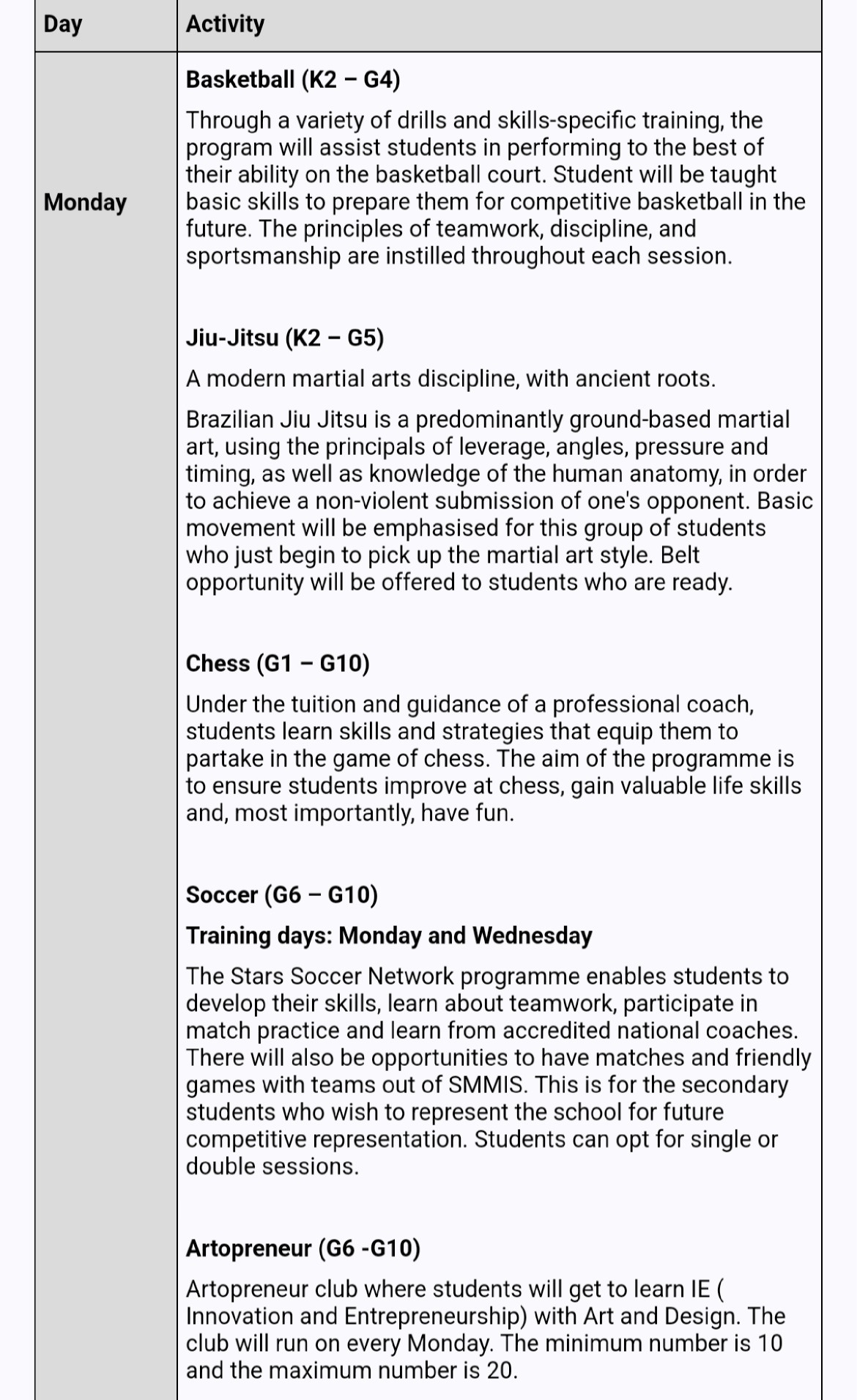 우리 아이가 다니는 국제학교는 하교시간이 4시이다. 그리고 학기 중에 방과 후 활동인 ASA(After-School Activities)를 운영하는데 아이 학교의 방과 후 프로그램은 월-목 주 4회 운영되고 요일마다 프로그램이 아래처럼 다르게 운영된다.