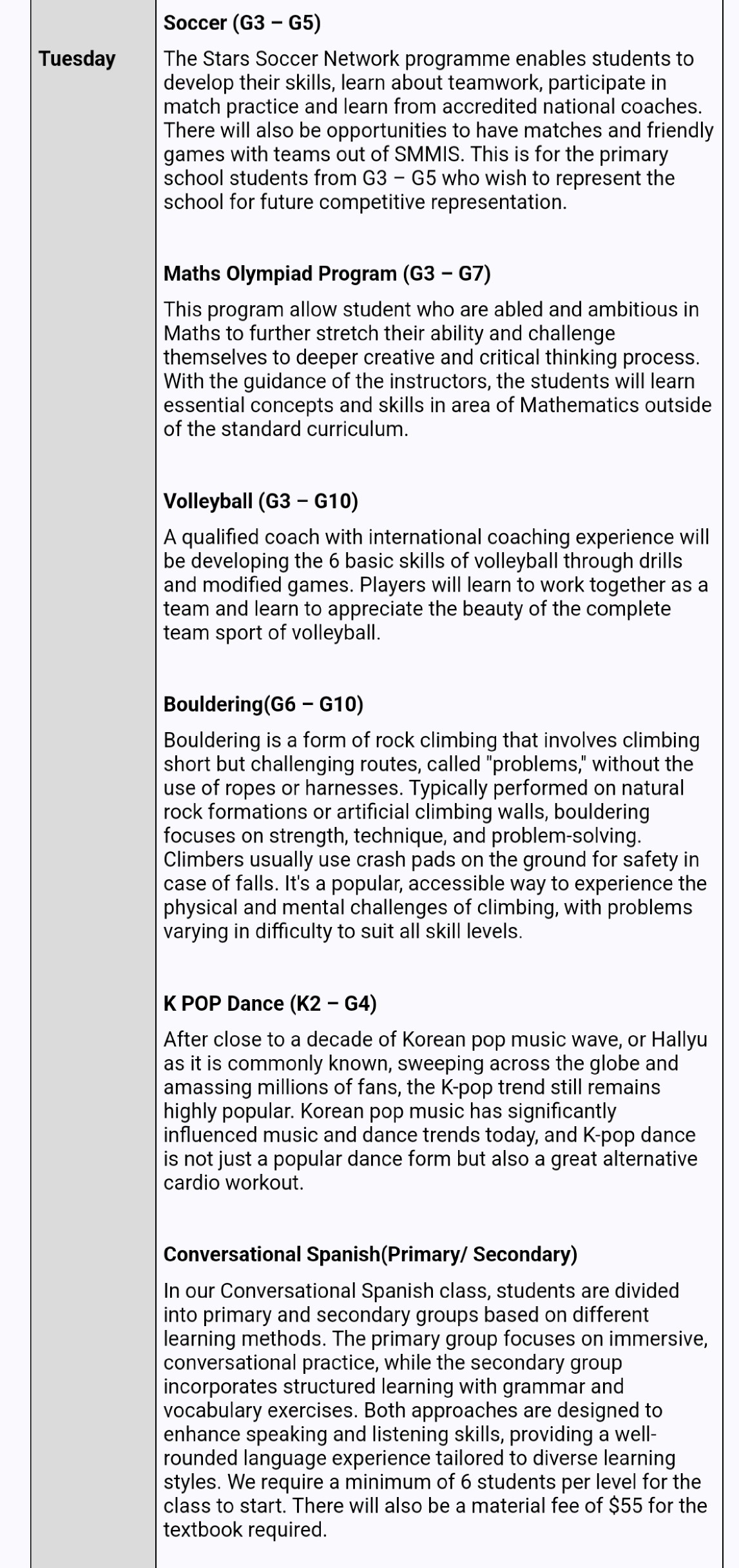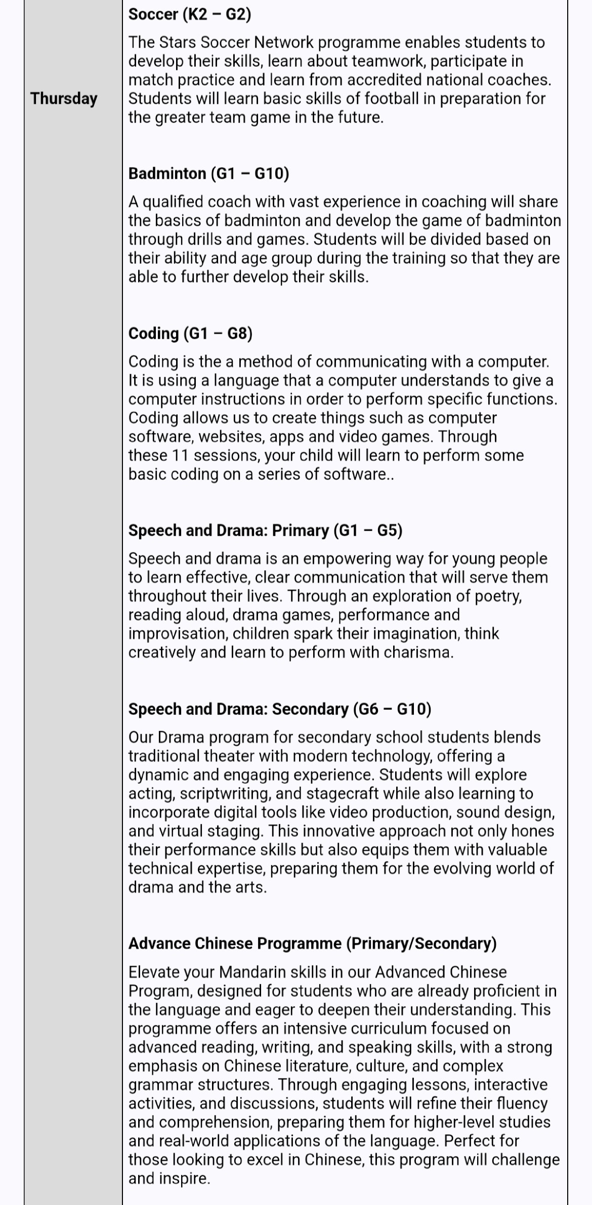 특히 운동, 취미에 관한 수업이 많은데 학교생활에 충실한 아이들은 학습적인 방과 후 수업보다 체력을 다지거나 취미생활을 할 수 있는 수업을 많이 원하는 것 같다. 또 제2외국어 방과 후 수업이 다양하게 있어서 좋았다. 중국어 반은 심화반으로 싱가포르 공용어 중 하나가 중국어이기 때문에 중국어가 모국어인 아이들을 제외하고 다른 학생들도 중국어에 관심이 많은 편이다.