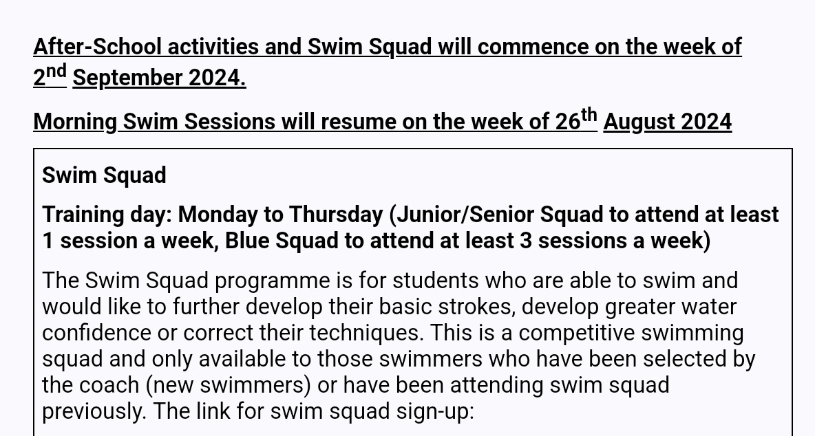 그동안 아이에게 한국에서 해왔던 태권도나 바이올린 등의 예체능 활동을 다시 시작할 것을 권해봤으나 학교 적응 초기 하교하면 피곤해하는 아이를 너무 힘들게 하는 것 같아서 그만두었다. 하지만 이번 겨울방학 때 다시 아이에게 ASA 시간표를 보여주면서 하고 싶은 활동이 없냐 물어보니 수영에 관심이 있다고 했다!!