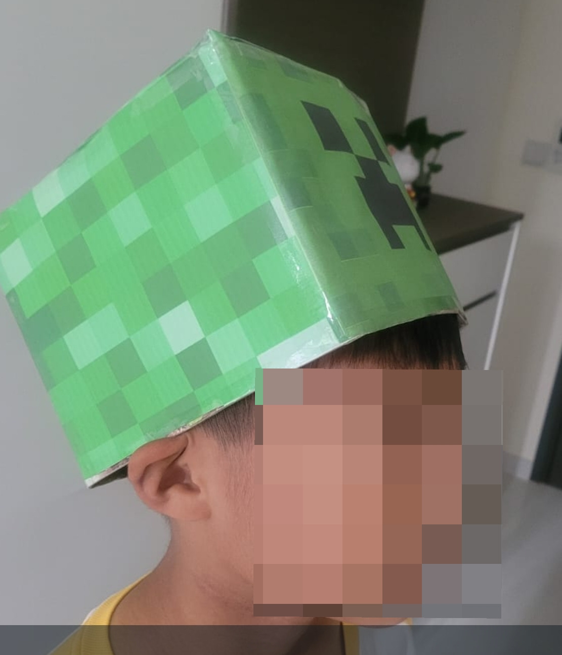 우리는 아이가 좋아하는 마인크래프트의 크리퍼 이미지를 모자로 만들기로 결정했다. 마침 집에 한국에서 공수한 비비고 김박스가 있었는데 아이 머리에 얼추 맞는 듯했다. 아이아빠가 박스를 아이 머리에 맞게 세심하게 자르고 내가 인터넷에서 크리퍼를 출력한 후 상자에 붙여 완성했다. 앞머리 길이에 집착하는 준 사춘기 아들은 웬일인지 이건 부끄럼 없이 쓰고 가겠다고 해서 속으로 웃었던 기억이 난다.