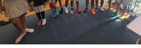 이벤트를 기념하는 작품을 만들어 게시하기도 하고 선생님도 동참하는 오드삭스데이를 기념해서 사진을 찍어 보내주시기도 했다. 원래 아이 학교는 양말색깔, 신발색깔까지 정해주는 학교라 이러한 칼라풀한 색깔을 신을 수가 없는데 아이들도 이 행사를 즐겼던 것 같다.