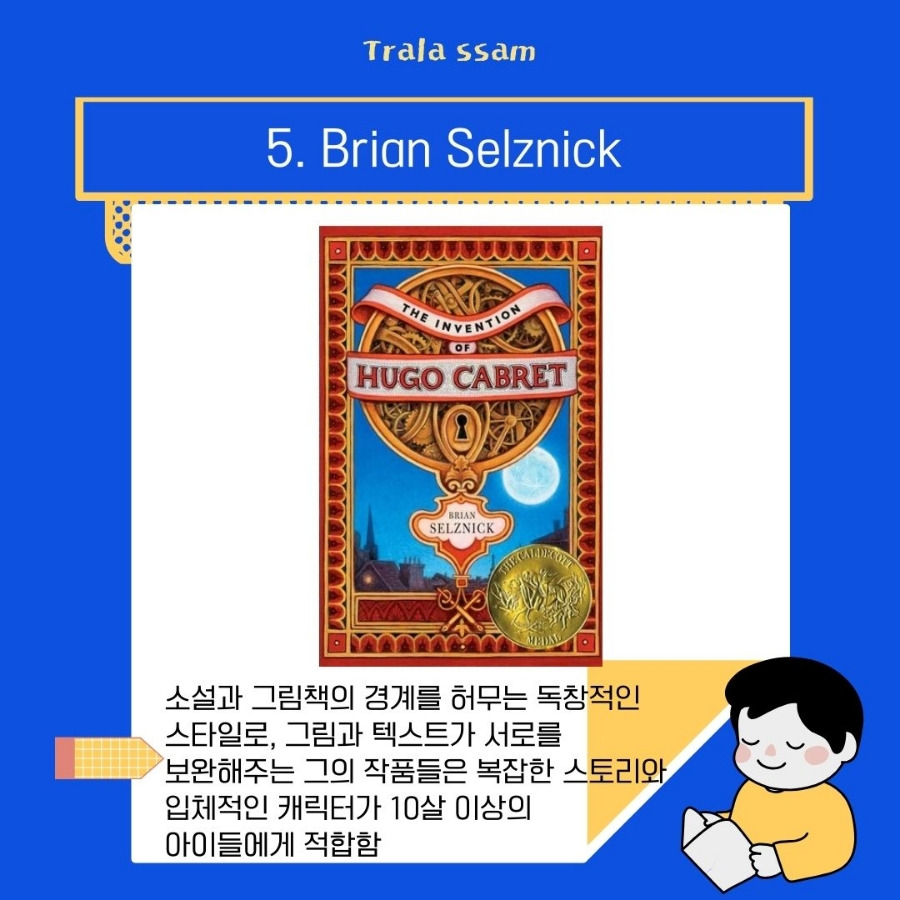 브라이언 셀즈닉은 소설과 그림책의 경계를 허무는 독창적인 스타일의 작가이다. 복잡한 스토리와 입체적인 캐릭터가 10세 이상 독자들에게 적합하며 특히 대표작인 [The Invention of Hugo Cabret]는 그림과 글이 결합된 독창적인 형식으로 유명하다 또 다른 작품인 [Wonderstruck]는 과거와 현재가 교차하는 독특한 구성을 보여준다.