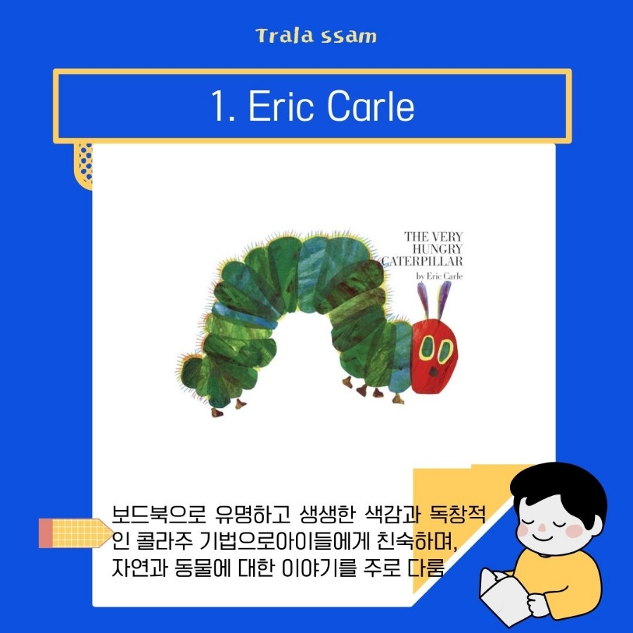 화려한 색감이 돋보이는 Eric Carle의 그림책은 미술학원에서도 이 책으로 따로 수업을 할 정도로 생생한 색감과 독창적인 콜라주 기법을 사용하여 눈길을 끈다. 주로 아이들이 좋아하는 자연과 동물에 관한 이야기를 다루고 숫자와 요일을 배울 때도 참고할 만한 책이 많다.