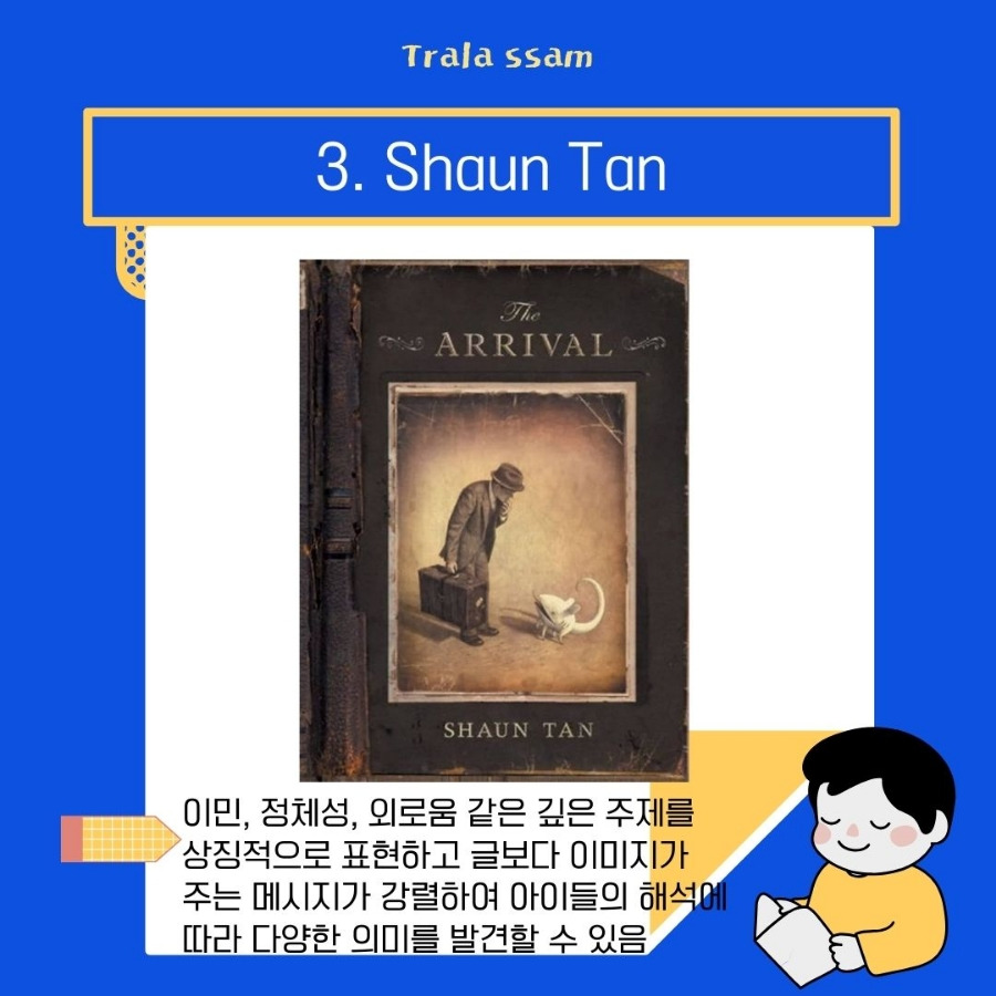 숀탠은 이민, 정체성, 외로움 같은 깊은 주제를 상징적이고 환상적인 그림으로 표현하는 작가이다. 글보다 이미지가 주는 메시지가 강렬하여 독자의 해석에 따라 다양한 의미를 발견할 수 있다.