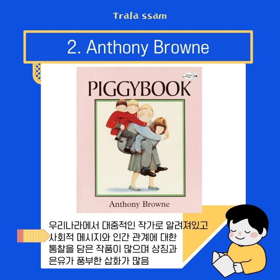 앤서니 브라운 전시가 따로 있을 정도로 한국에서는 많은 인기를 누리고 있는 앤서니 브라운은 사회적 메시지와 인간관계에 대한 통찰을 담은 작품이 많다. 그림이 밝고 색감이 아름다우며 상징과 은유가 풍부한 삽화를 많이 그려 아이들이 새로운 시각에서 이야기를 느낄 수 있도록 하는 작가이다.